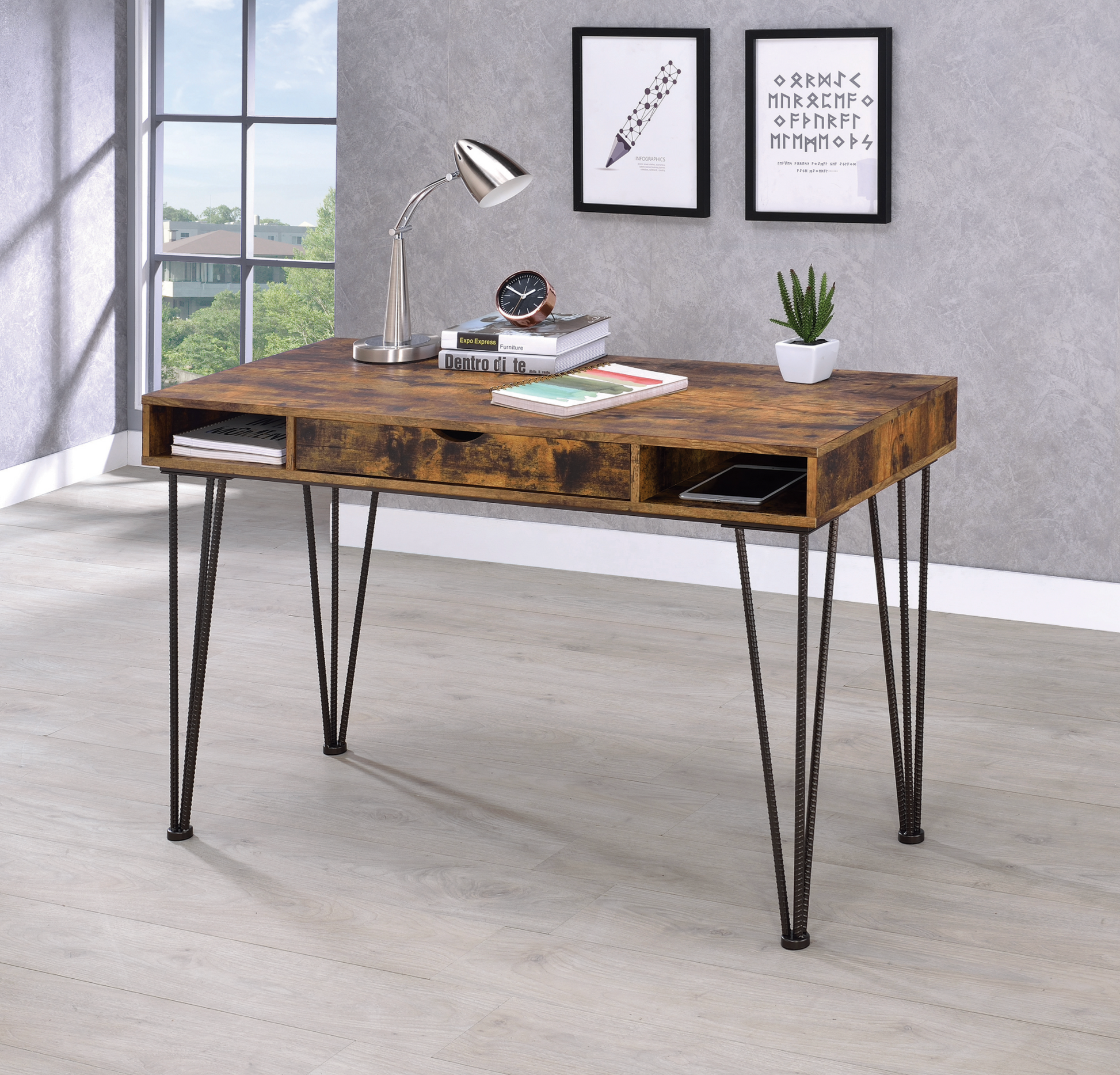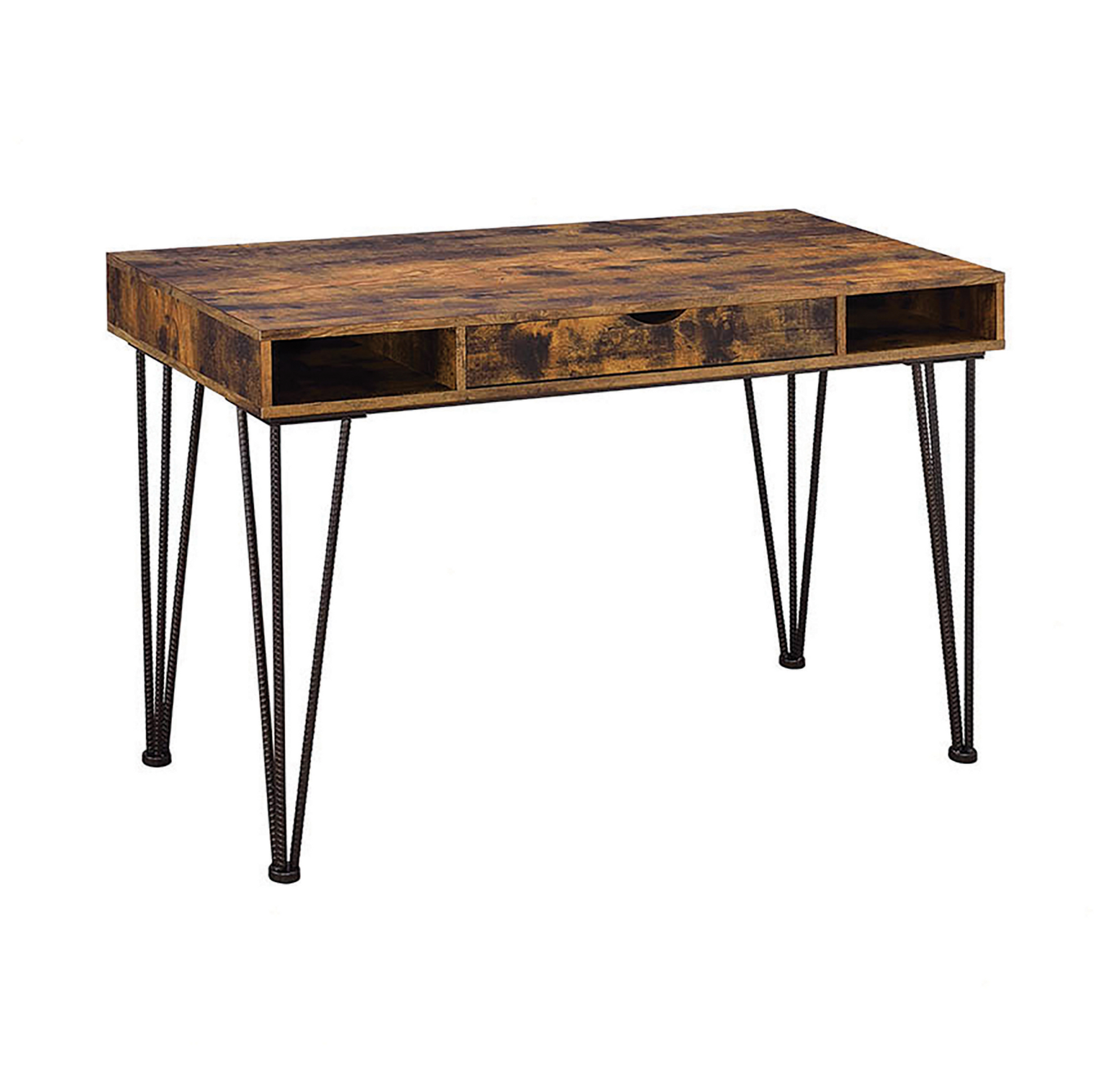 This elegant industrial style writing desk is a splendid addition the home or commercial office. It features open storage compartments on either side and a center drawer with Euro glides. It's built with steel, particle board, and engineered veneer for reliable durability. The desk top easily accommodates a laptop and notebooks as well as a small table lamp. It's handsomely finished in antique nutmeg with solid metal rebar legs that are finished in dark bronze for a rich appeal and warm ambiance.