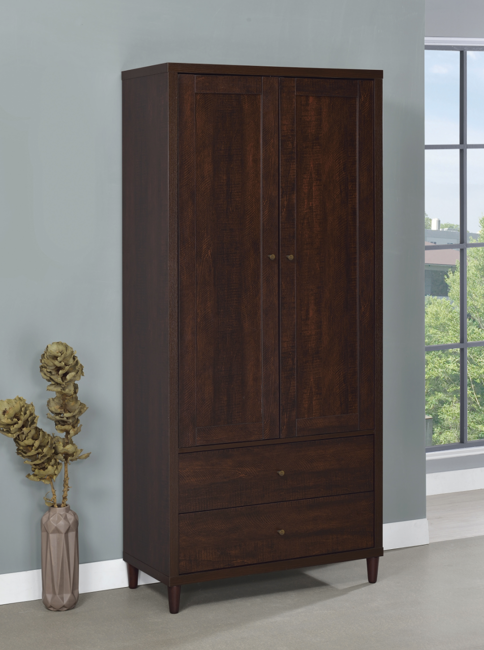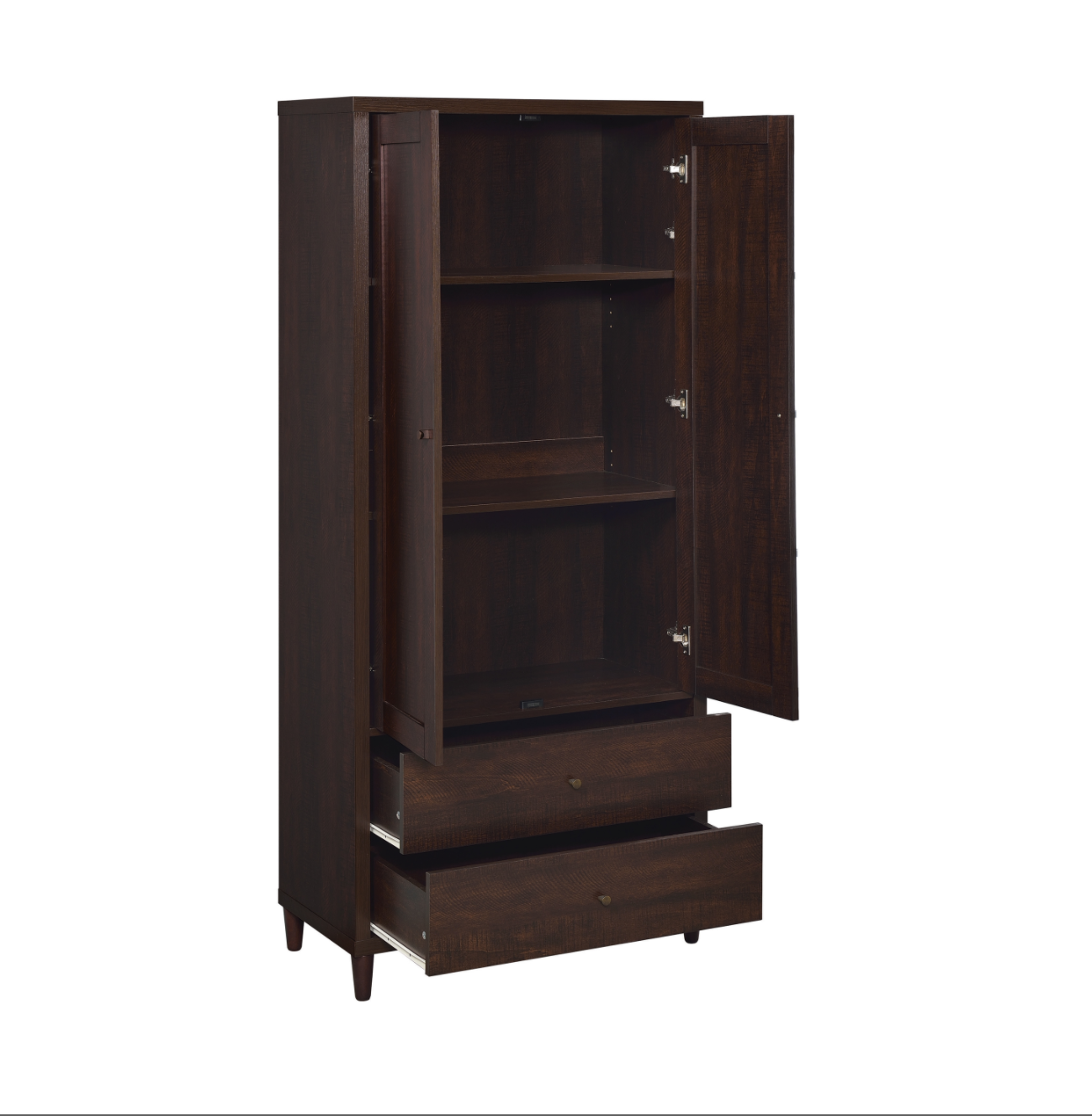 This impressive accent cabinet imparts an imposing presence to the home. At over six feet tall, it has the capacity to take on all storage needs. Two doors open up to ample space. Below are two deep drawers for additional storage of everything from sofa covers to extra plateware. The cabinet is finished in rustic tobacco for a warm, inviting ambiance.