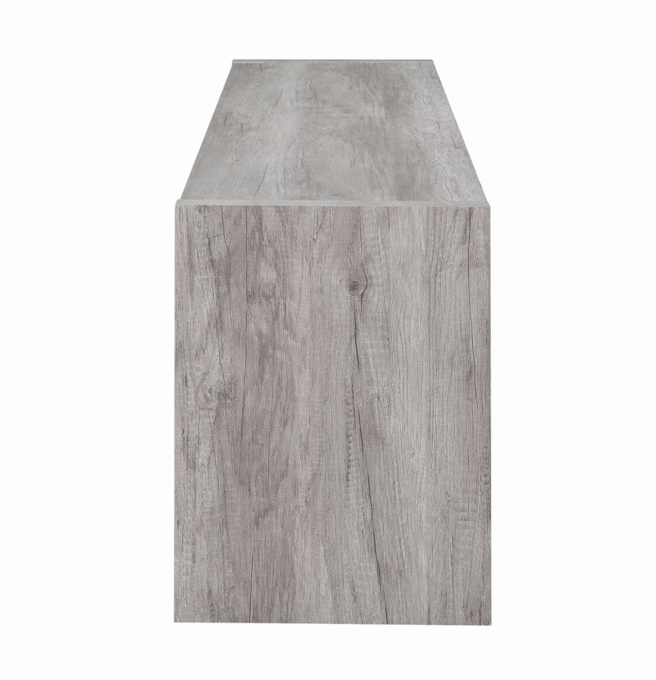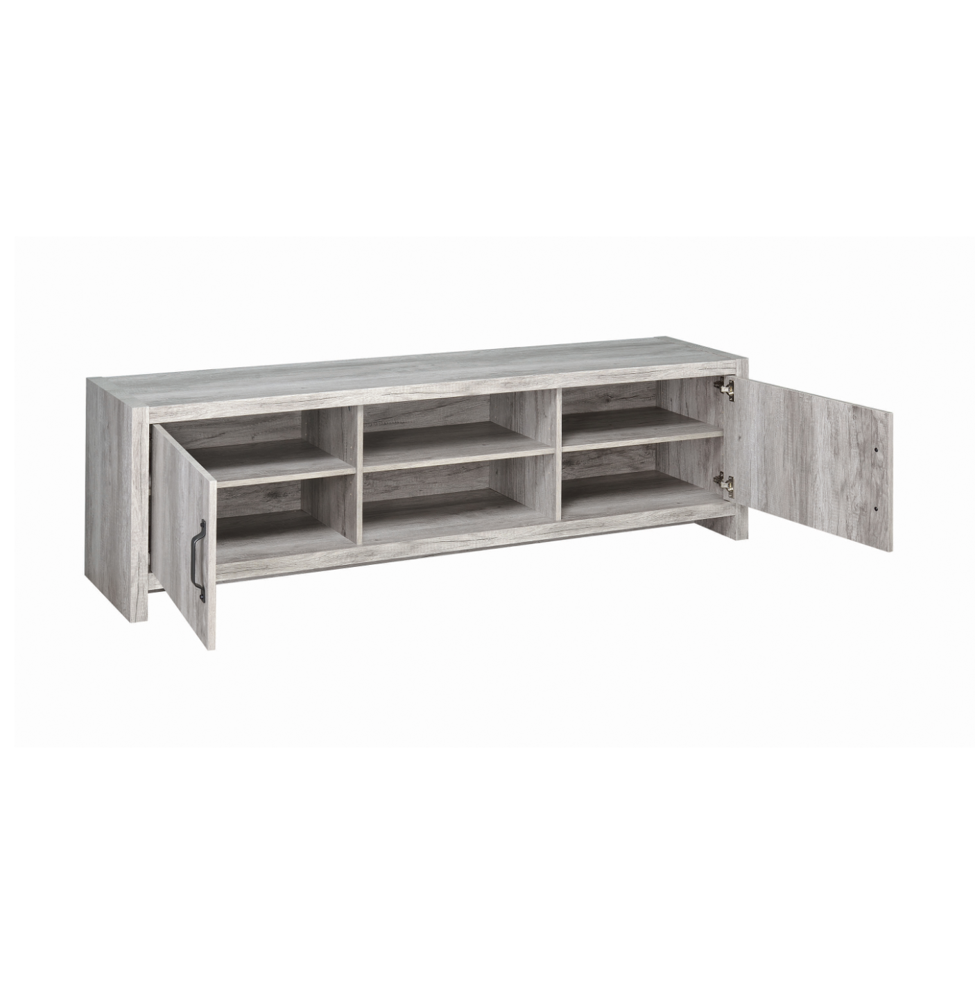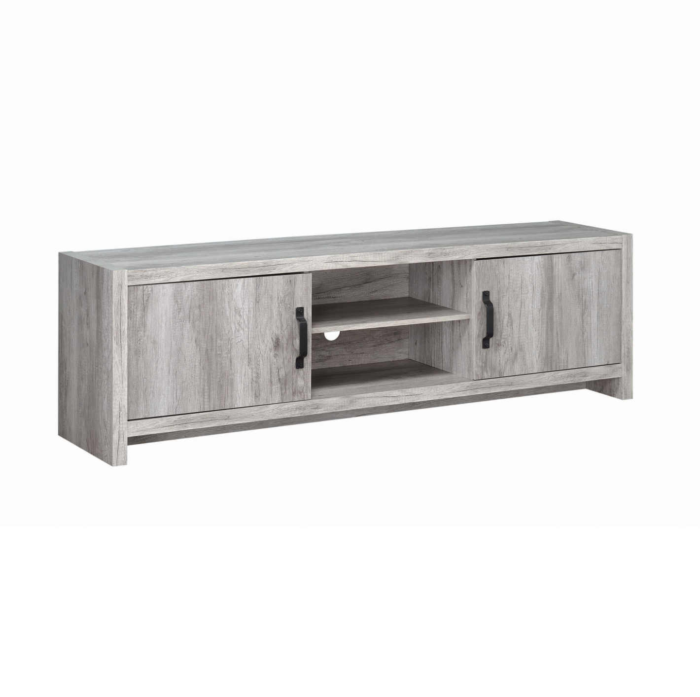 Stylize a modern space with light and airy attitude. Make this TV console a central focus in an entertaining space. A lovely grey driftwood finish reveals a natural grain effect. A spacious surface supports large-screen televisions, while a pair of open center shelves make room for components. Add more devices and media in two side cabinets.