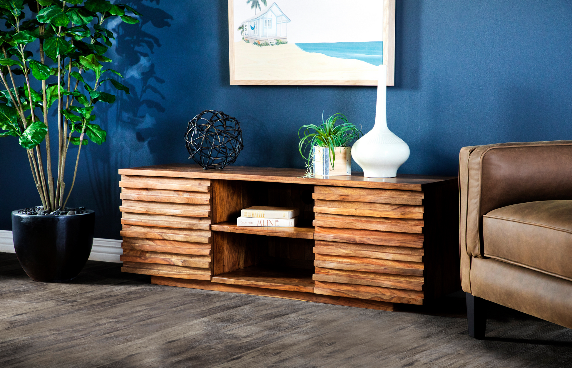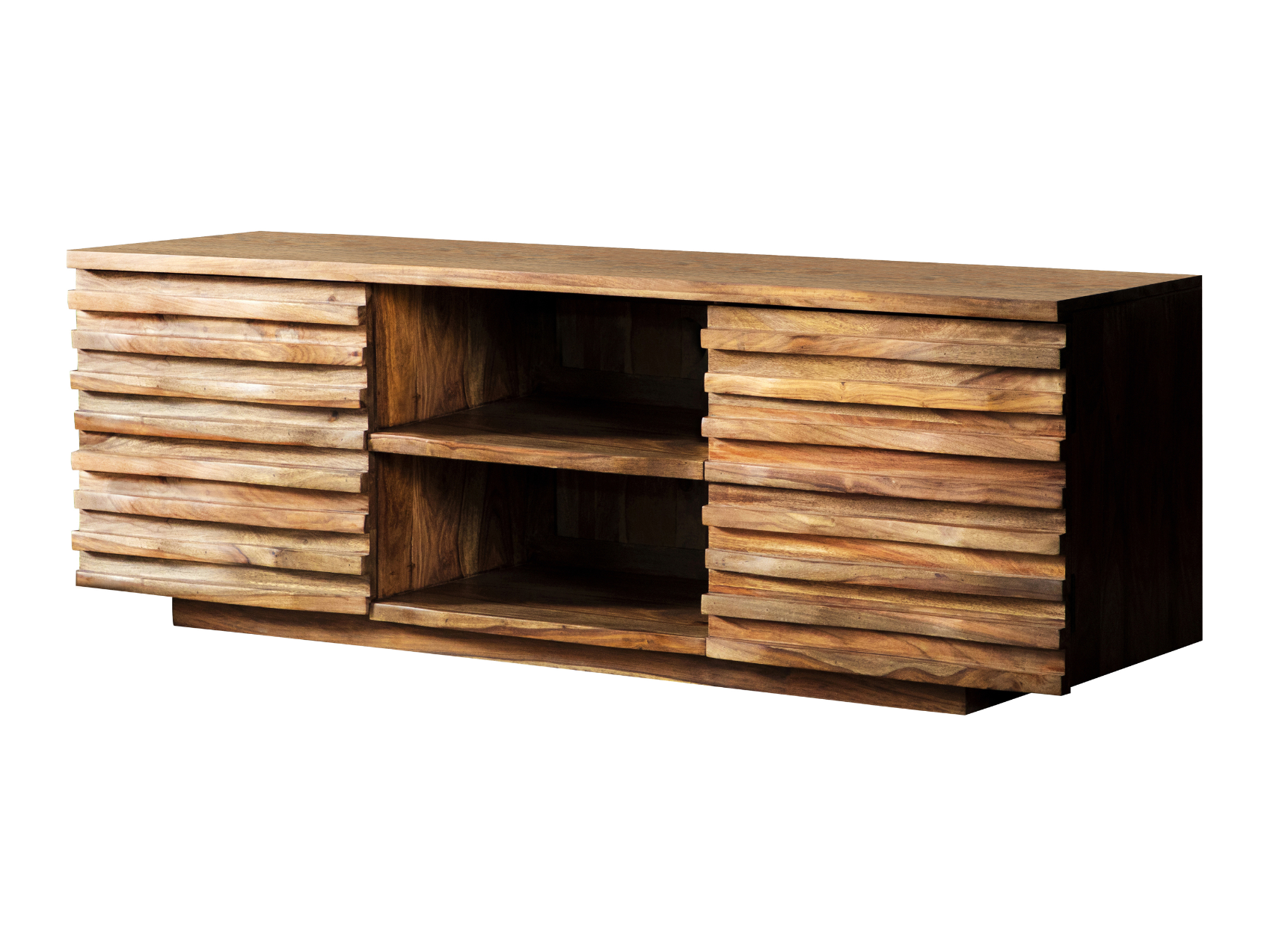 Give your living room a global-inspired feel with this rustic TV console. Designed with solid Sheesha wood that lends a gorgeous wood grain details and markings, this console makes a warm, striking addition to a home. A spacious top accommodates up to a 48-inch TV with plenty of storage space for DVDs, CDs and entertainment consoles in the storage space below. Two large open shelves keep decor and an entertainment system, while two cabinets conceal clutter and other items. A fingertip pull on each of the cabinet doors allows for a seamless horizontal plank facade that offers a visual texture to a space.
