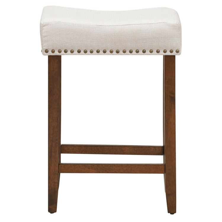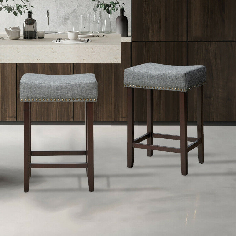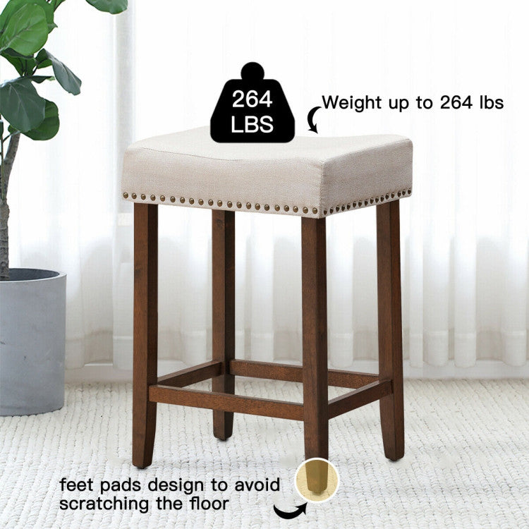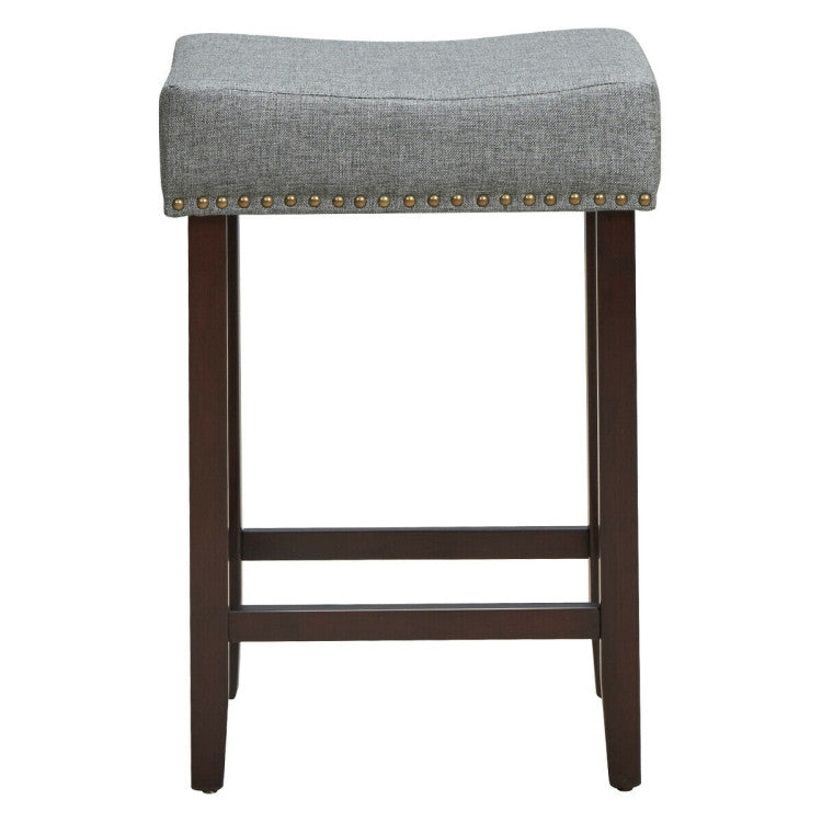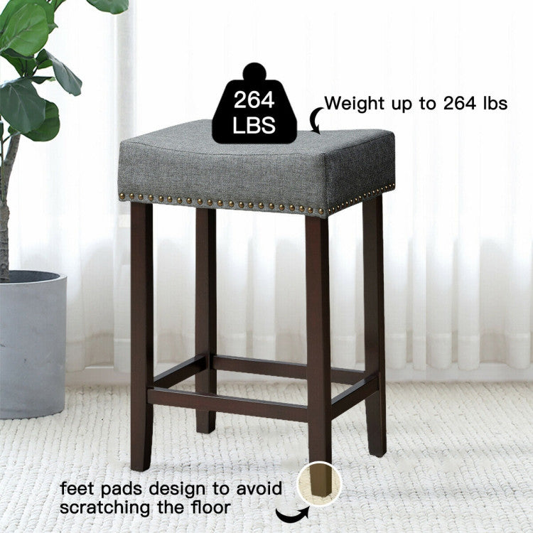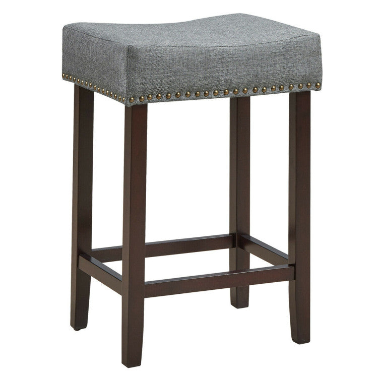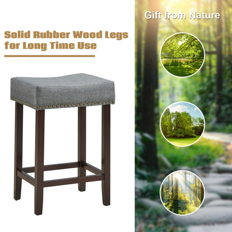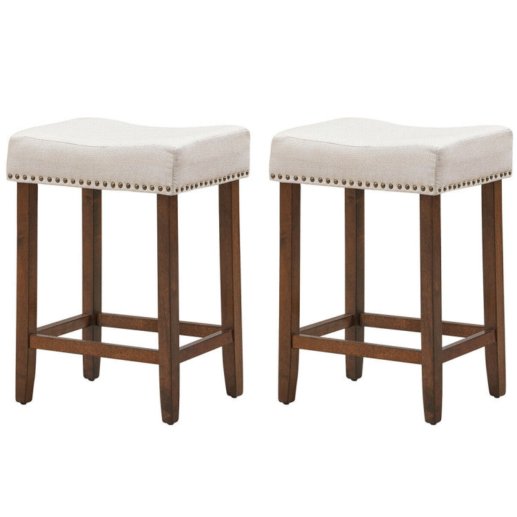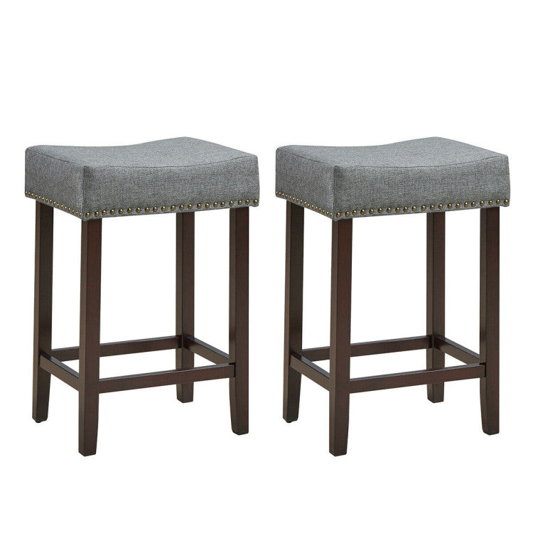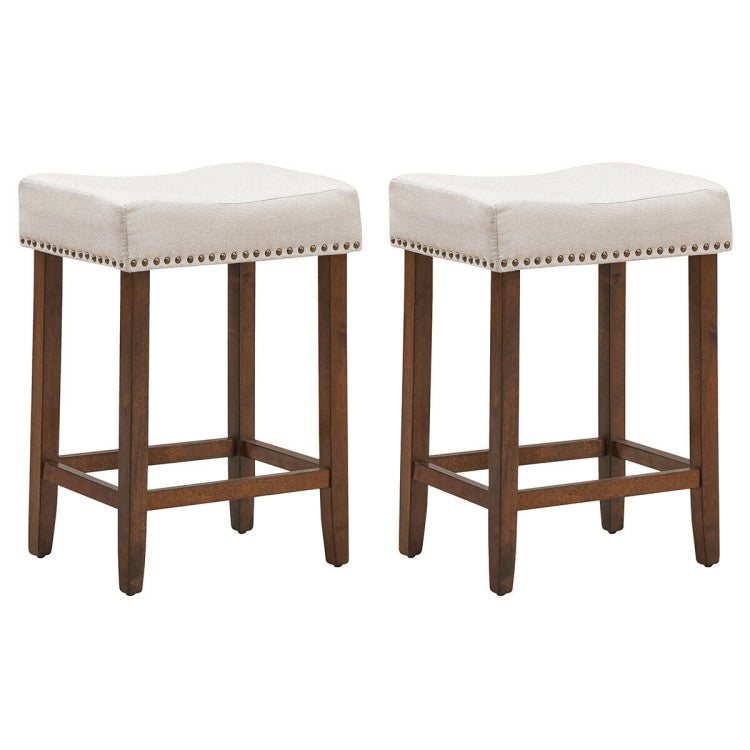 24 Inch 2 Pieces Nailhead Saddle Bar Stools with Fabric Seat and Wood Legs