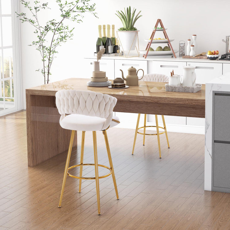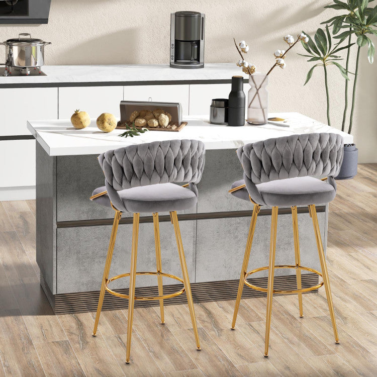 29 Inch Velvet Bar Stool Set of 2 with Woven Backrest and Gold Metal Legs