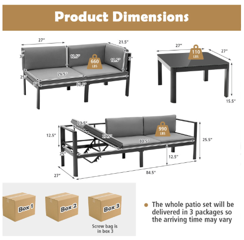 ● 3-Package Delivery: This 3-piece aluminum sofa set will be delivered in 3 packages so the arriving time may vary. And the screw bag for the whole set is in box 3. With the clear instruction, you can finish the assembly in higher efficiency. Dimension of loveseat: 55" x 27" x 25.5" (L x W x H). Dimension of 3-seat sofa: 84.5" x 27" x 25.5" (L x W x H). Dimension of coffee table: 27" x 27" x 15.5" (L x W x H).