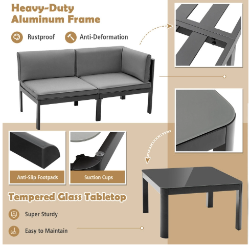 ● High-Grade Material: This 3-piece patio sofa set is mainly made of top-grade aluminum, which is rustproof and anti-deformation. And the anti-slip footpads protect the ground from scratches. Furthermore, the tabletop of coffee table is made of tempered glass, which is super sturdy and easy to maintain. And the suction cups firmly fix the tabletop in place.