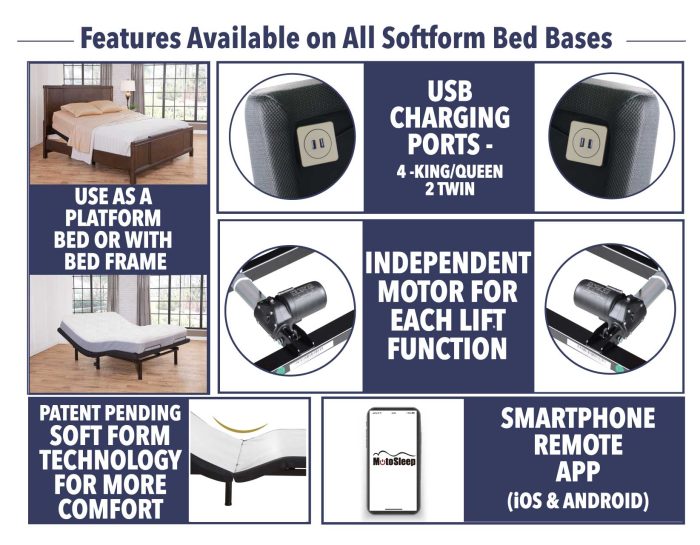 Read, watch TV, work or just relax in bed in the most comfortable positions with the Softform Adjustable Bed Base. No longer do you have to prop up your head with pillows to relax…with the Softform base, you get to choose your most comfortable position in bed with the independent incline of the head and foot of the bed. Choose the exact position you want or choose from one of the four presets: lay flat, TV, Anti-Snore or Zero-Gravity. Or use one of the 2 programmable buttons to save your favorite bed positions for instant use. The 350MSA allows control of head, foot, lumbar and neck for the ultimate in position comfort. Plus, head and foot massage with three levels of intensity and motion-controlled under bed LED lights to illuminate the night. Control the comfort of your bed from the wireless remote or download the app and position the bed right from your phone. Either way, you will be amazed and the new comfort and flexibility of your new adjustable bed.