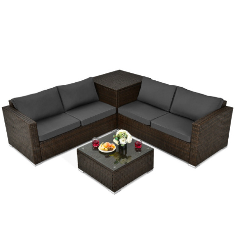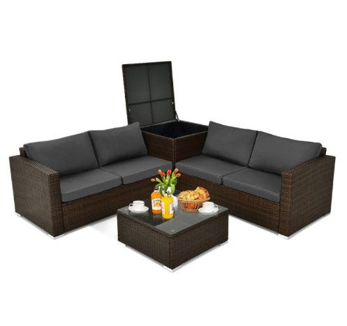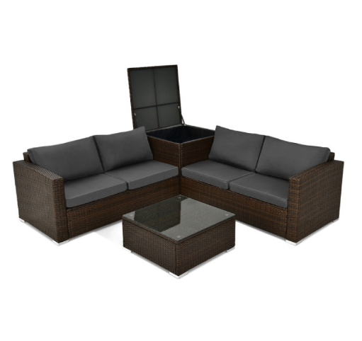4 Pieces Patio Rattan Cushioned Furniture Set with Armrest and Storage Box