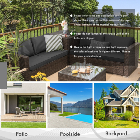 ● Package and Installation Tips: This patio sectional sofa set comes with 3 boxes, which may not arrive on the same day. If you have any questions about the package or product, please feel free to contact us. We will always get your back. As for installation, we suggest that please do not tighten all the screws until all the holes are aligned.