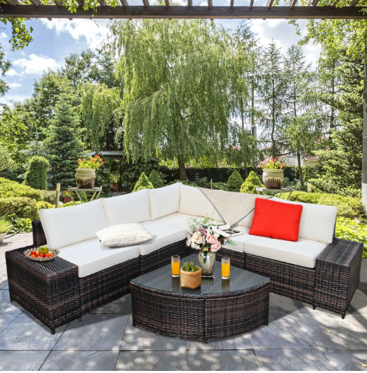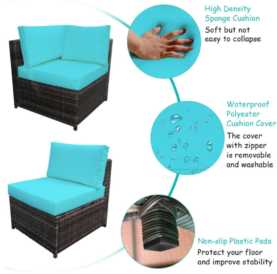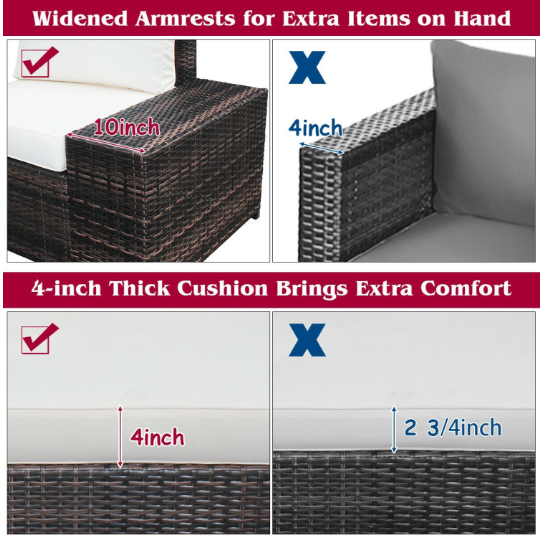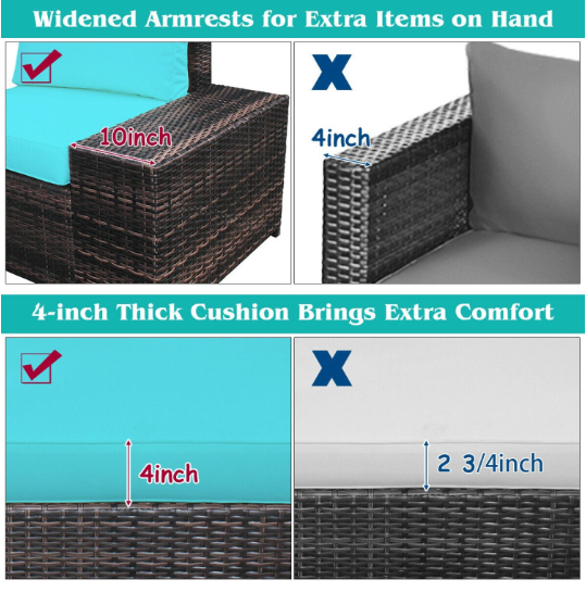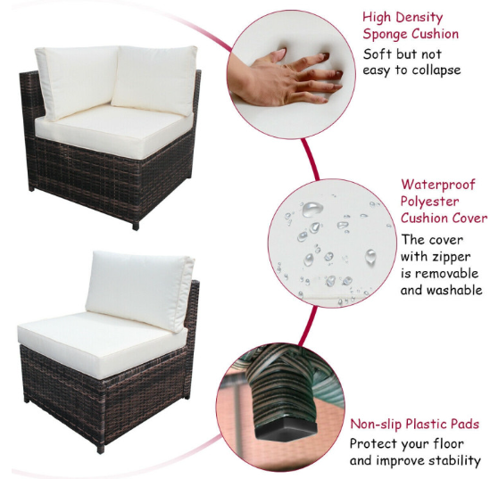 ● Ergonomic and Comfortable Sectional Sofa: Each chair of this outdoor sofa set is equipped with 4-inch thick cushions filled with soft and high-density foam to provide the ultimate comfort. Moreover, the breathable polyester cushion cover with zipper is very easy to remove and wash. And 2 chairs are equipped with 10-inch wide armrest for extra convenience.