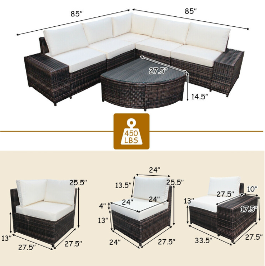● Size Information of Patio Furniture Set: Table size: 27.5" x 14.5" (D x H), corner chair size: 27.5" x 27.5" x 25.5" (L x W x H), single arm chair size: 33.5" x 27.5" x 25.5" (L x W x H), armless chair size: 24" x 27.5" x 25.5" (L x W x H), height from floor to seat: 13", height from floor to armrest: 17.5", armrest size: 27.5" x 10" (L x W) thickness of cushion: 4", table weight capacity: 190lbs, chair weight capacity: 450lbs
