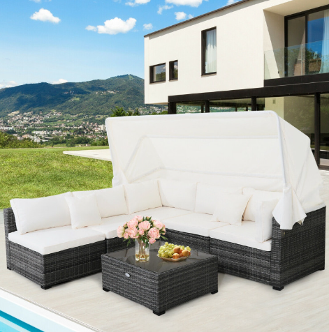 ● Retractable Canopy: Featuring a retractable canopy with premium gas springs, this outdoor patio furniture set allows you to open and close the canopy quietly and quickly while meeting various demands of outdoor activities. There are fixed ropes keeping the canopy in place. Therefore, this patio furniture set is perfect for reading with retractable canopy. And it is also perfect for sunbathing without canopy.