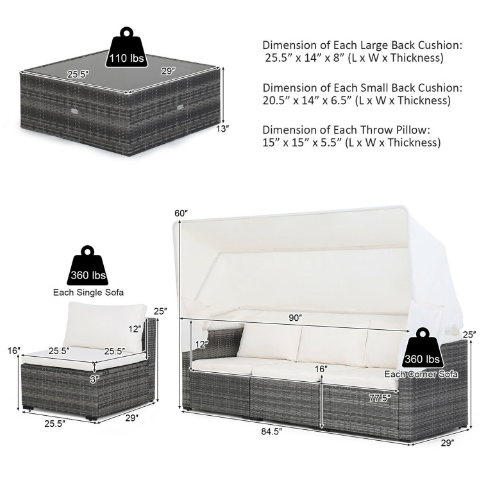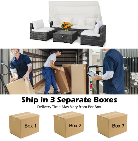 ● Product Information: This 6-piece patio furniture set will be shipped in 3 separate boxes that delivery time may vary from per box. Overall dimension of coffee table: 29" x 25.5" x 13" (L x W x H), overall dimension of each armless sofa: 29" x 25.5" x 25" (L x W x H), overall dimension of 3-seat sofa: 29" x 90" x 60" (L x W x H), dimension of each large back cushion: 25.5" x 14" x 8" (L x W x Thickness), dimension of each small back cushion: 20.5" x 14" x 6.5" (L x W x Thickness), dimension of each throw pillow: 15" x 15" x 5.5" (L x W x Thickness). Please refer to the size description before purchase (there may be small dimensional discrepancies because of the manual measurement).