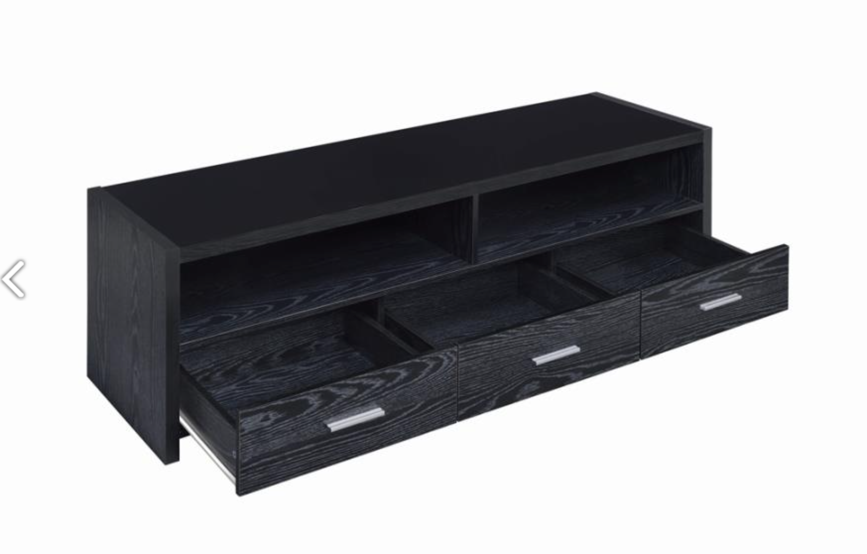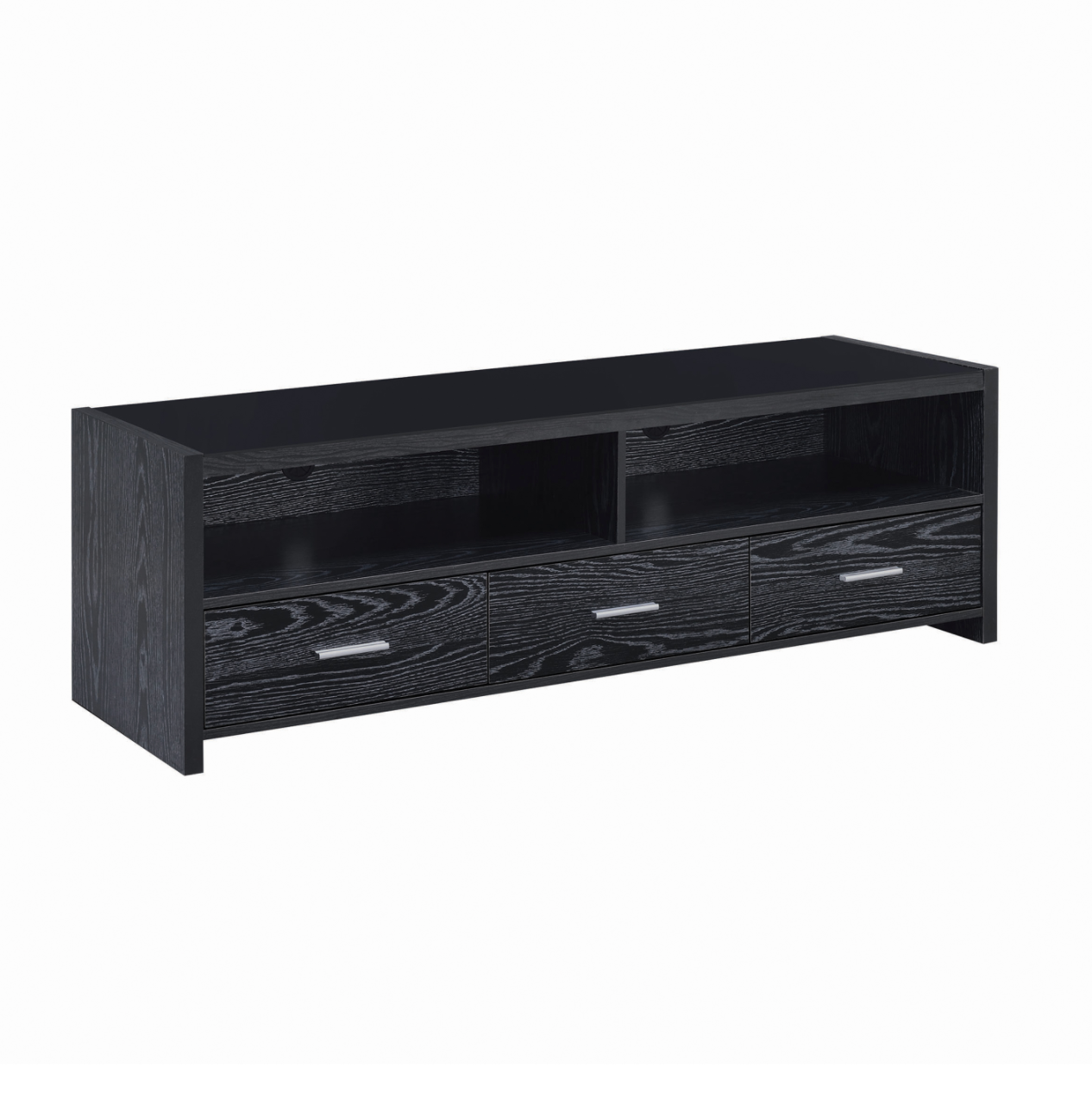 Sleek and modern, this TV console is a stylish choice. Exquisitely crafted from black oak, it boasts a classy, contemporary appeal that looks lovely in a den or family room. Brushed silver hardware creates a striking contrast to its bold, black finish. Three large drawers and two spacious compartments offer plenty of storage for electronics, games, movies, and more. Whether you're gathering loved ones for movie night or enjoying a gaming marathon, this console provides hours upon hours of entertainment.