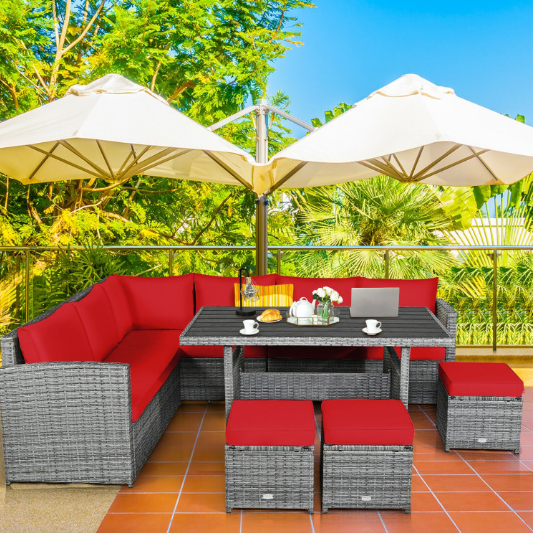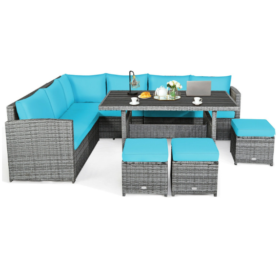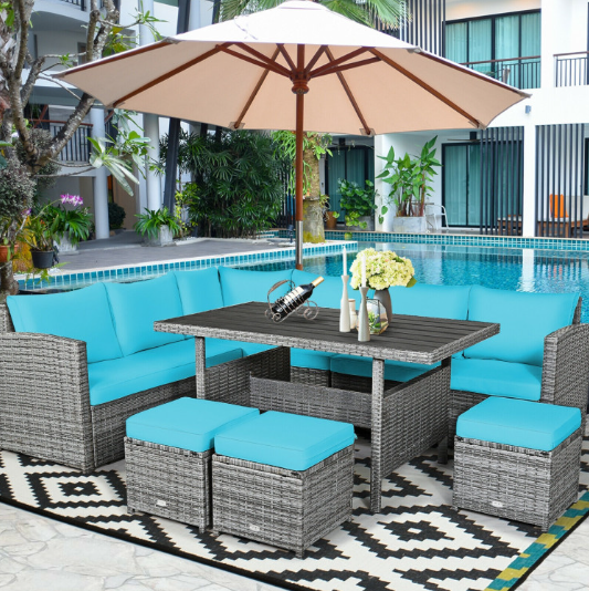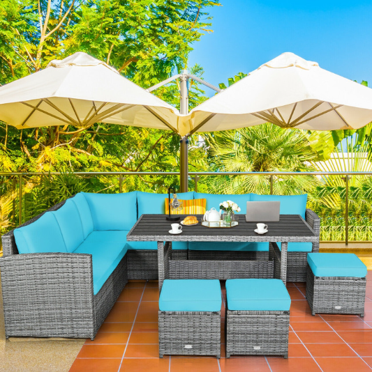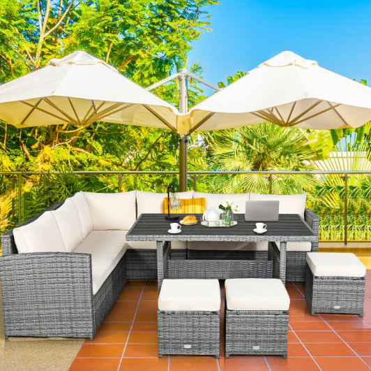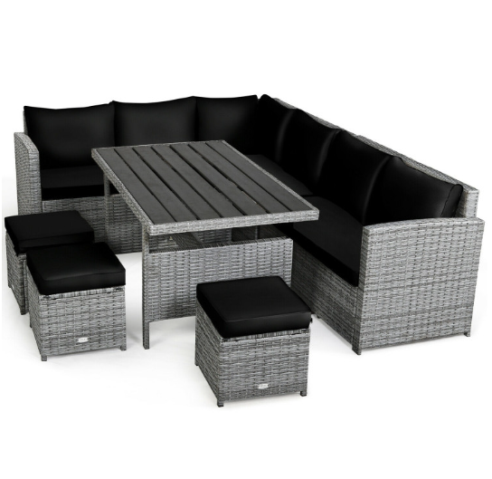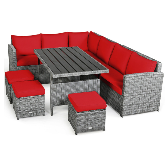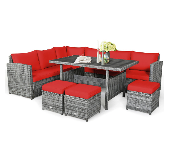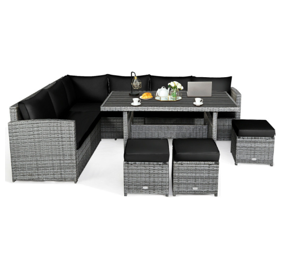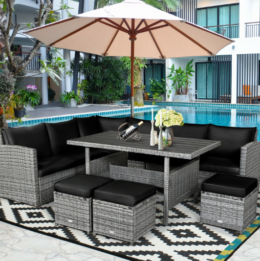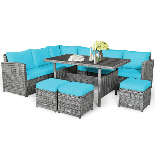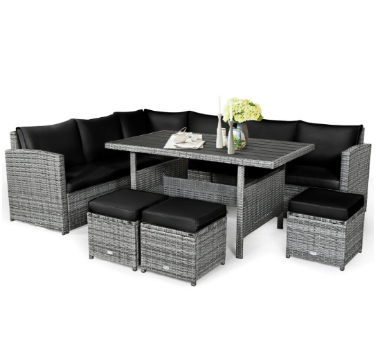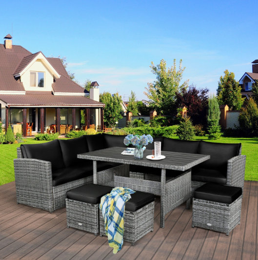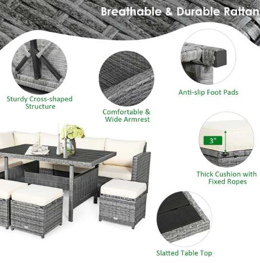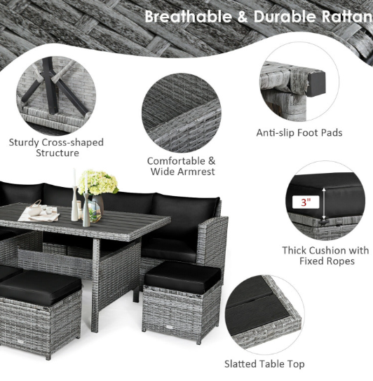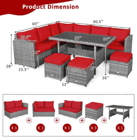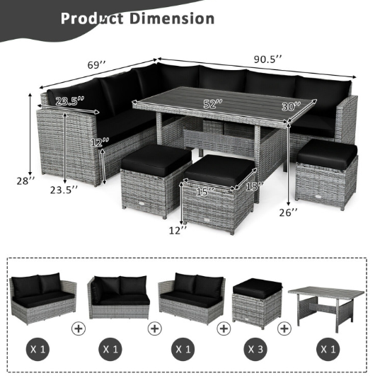 ● Easy Assembly and Dimensions: Coming with all the hardware and detailed instruction, it is easy to assemble the rattan sofa set. Corner chair size: 45" x 23.5" x 28" (L x W x H); Ottoman size: 15" x 15" x 12" (L x W x H); Dining table size: 52" x 32" x 26" (L x W x H); Weight capacity of corner chair, ottoman and table: 800 lbs, 400 lbs and 170 lbs.