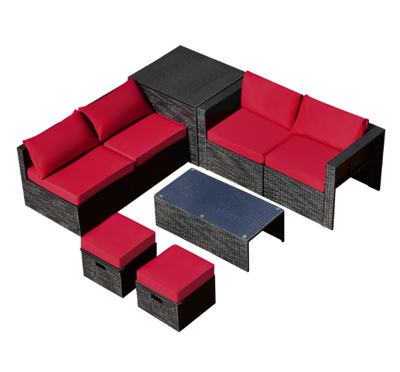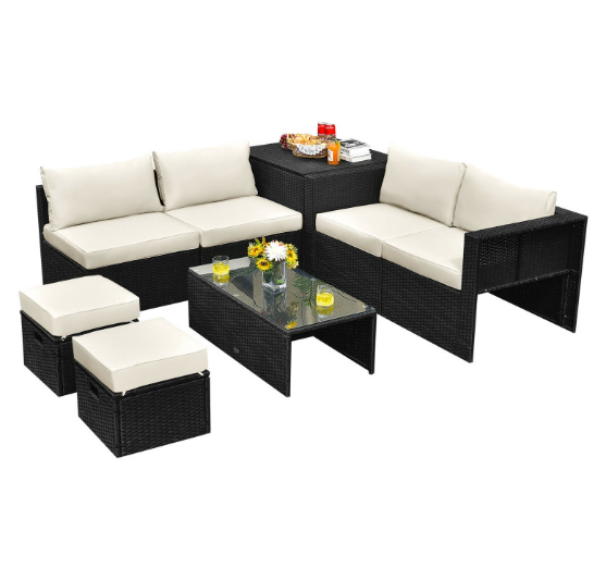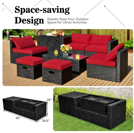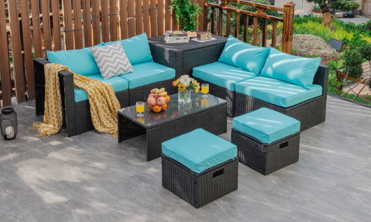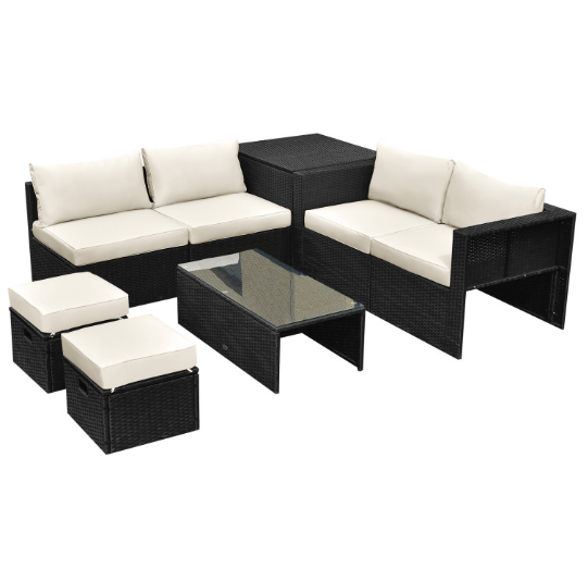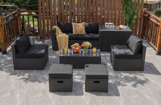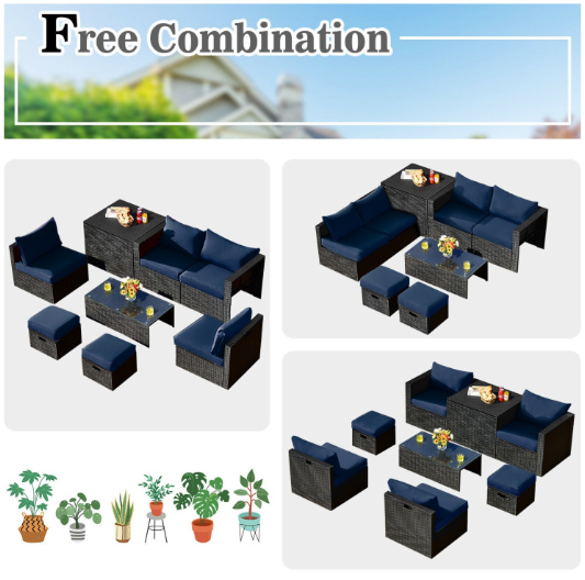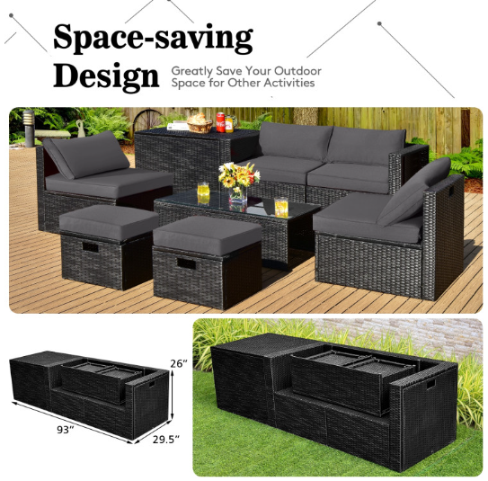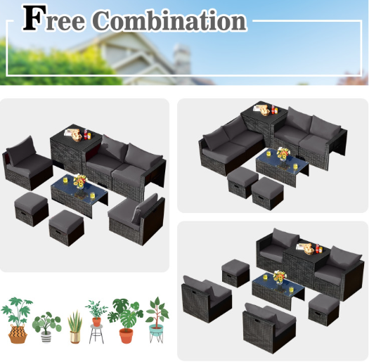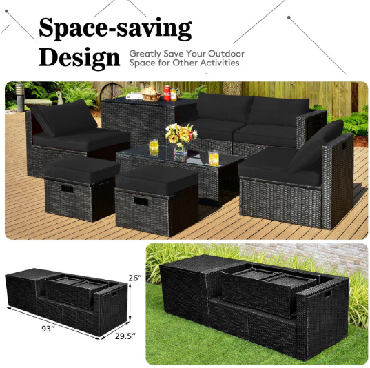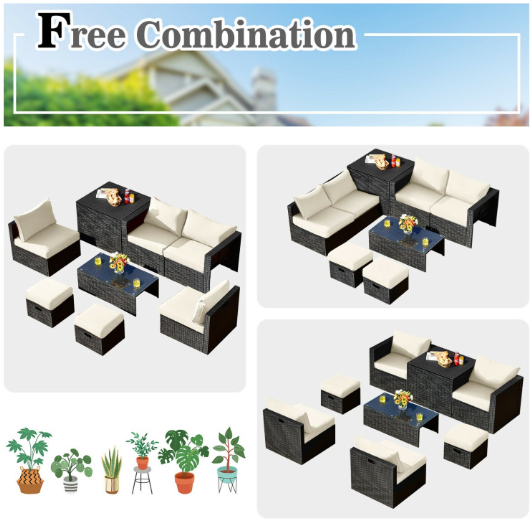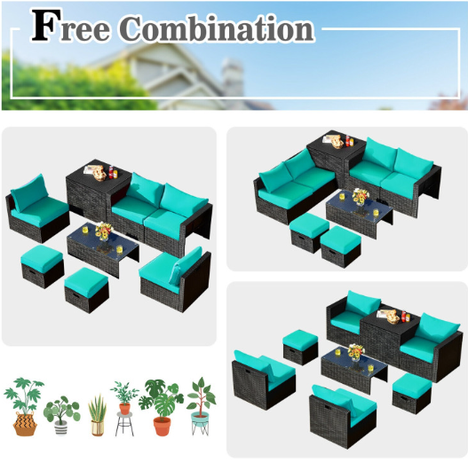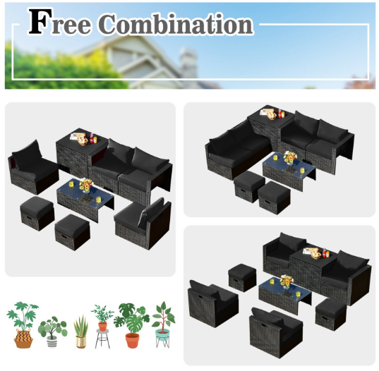 ● 8-piece Modular Set: In order to rearrange your outdoor space based on your preference and available place, this 8-piece outdoor patio furniture set with 1 tempered glass coffee table, 1 storage box, 2 ottomans, 2 armless sofas and 2 corner sofas allows you to combine them into different layouts for great flexibility.