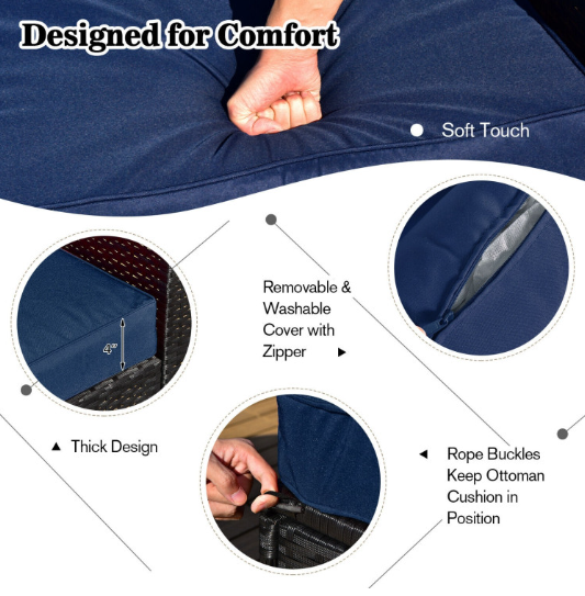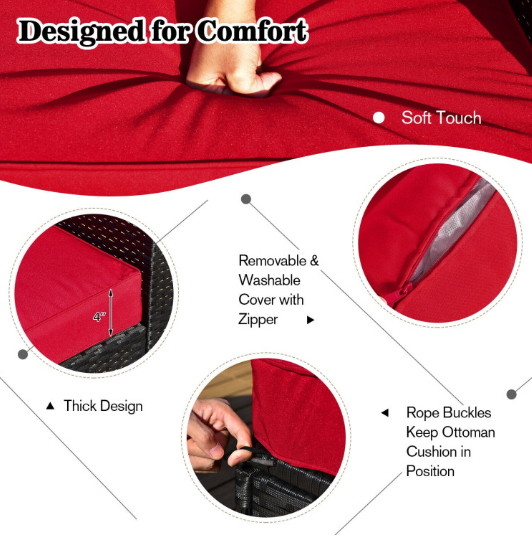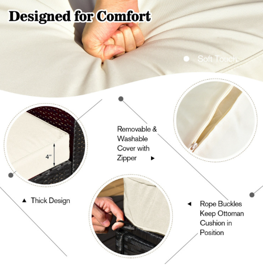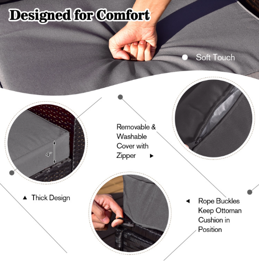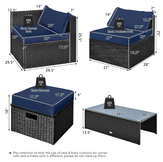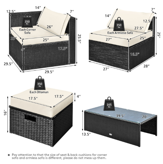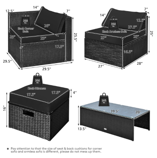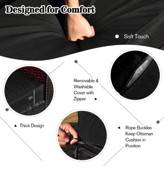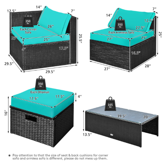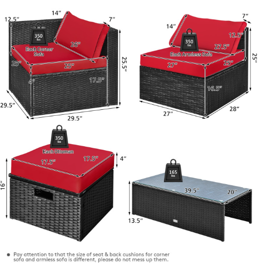 ● Comfy Cushions: Each ottoman, armless sofa and corner sofa are equipped with soft and thick cushions for optimal comfort. When you put legs on the ottomans, the ottomans’ cushions will not slip away because of fixing ropes and buttons. Besides, all the cushion covers can be removable for easy cleaning. Please note that the dimensions of the back and seat cushions of the armless sofa and corner sofa are different, do not mess them up. Take cushions inside if it rains.