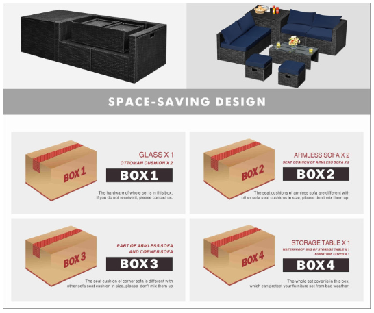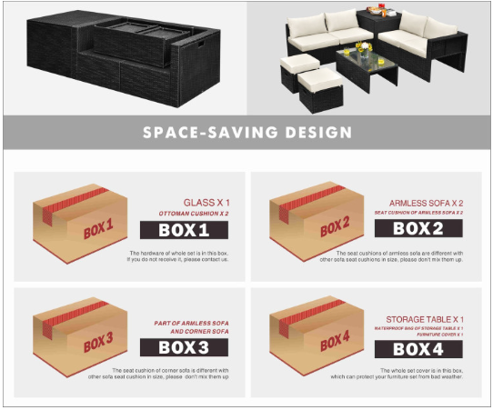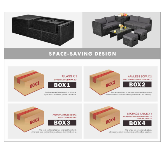 ● Product Information: The full set comes in 4 separate packages, which might not arrive on the same day. Overall dimension of table: 39.5" x 20" x 13.5" (L x W x H), overall dimension of storage box: 33.5" x 29.5" x 26" (L x W x H), overall dimension of each ottoman: 17.5" x 17.5" x 16" (L x W x H), overall dimension of each corner sofa: 29.5" x 29.5" x 25.5" (L x W x H), overall dimension of each armless sofa: 28" x 27" x 25" (L x W x H).