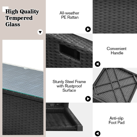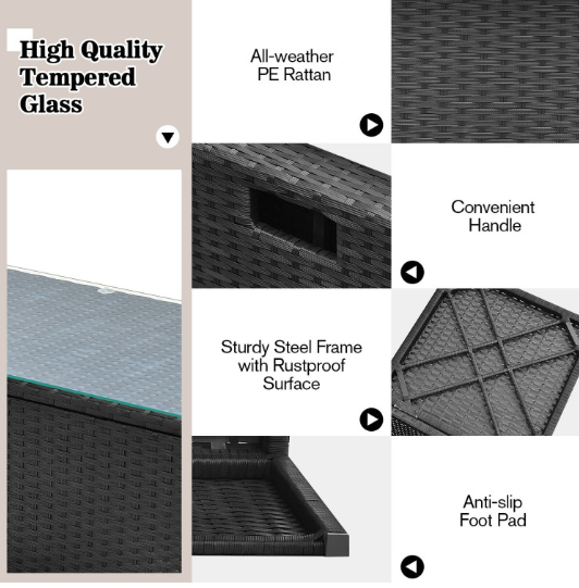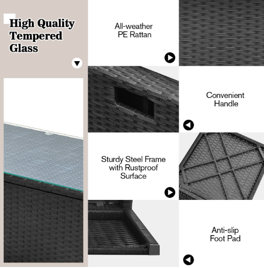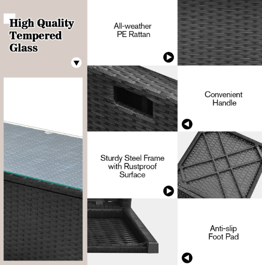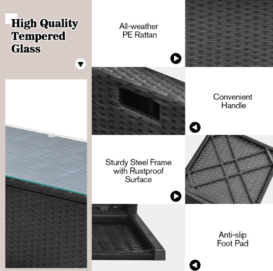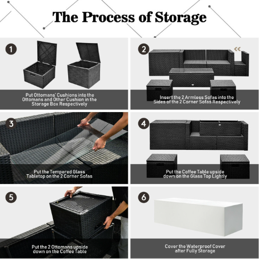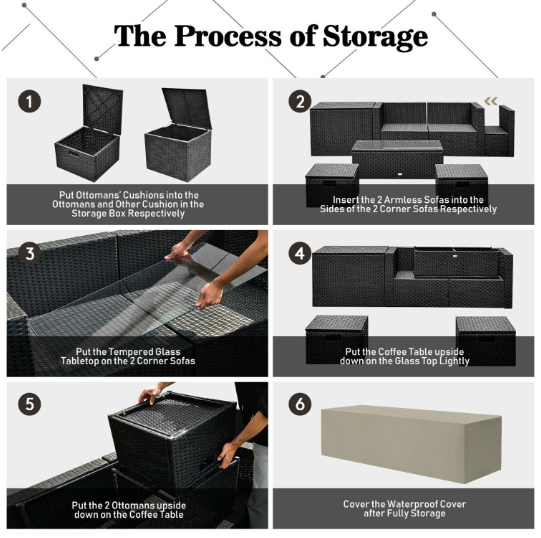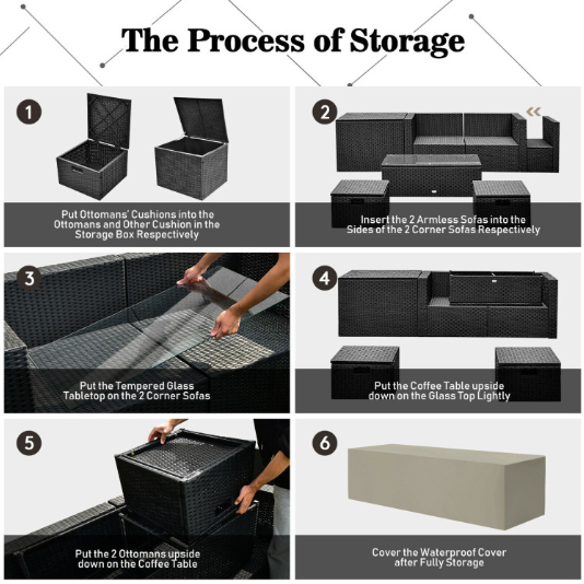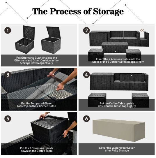 ● Waterproof Cover: After storage, there is a waterproof cover that allows you to cover it on the patio sectional set. Therefore, this furniture set can be left outside without worry. In addition, the weather resistant PE rattan and rustproof steel frame ensure its durability and firmness when used outdoors. And the anti-slip foot pads add extra stability while protecting the floor from scratching.