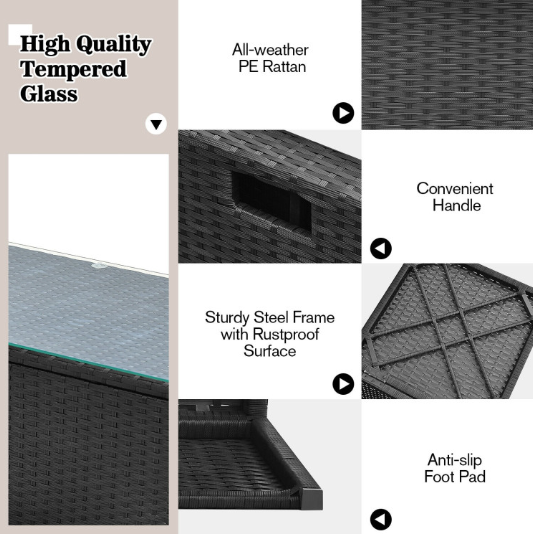 Material | PE rattan, steel, tempered glass, polyester, foam |