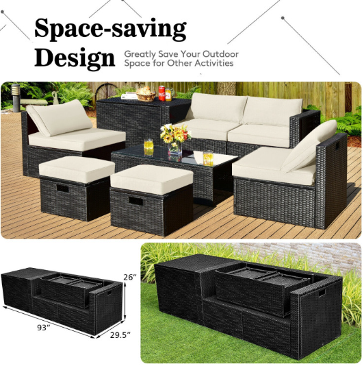 ● Space-saving Design: Different from the common outdoor furniture sets, this outdoor conversation set can be stored in a compact size that is 93" x 29.5" x 26" (L x W x H) in dimension. Therefore, it is able to greatly save your outdoor space when out of use.