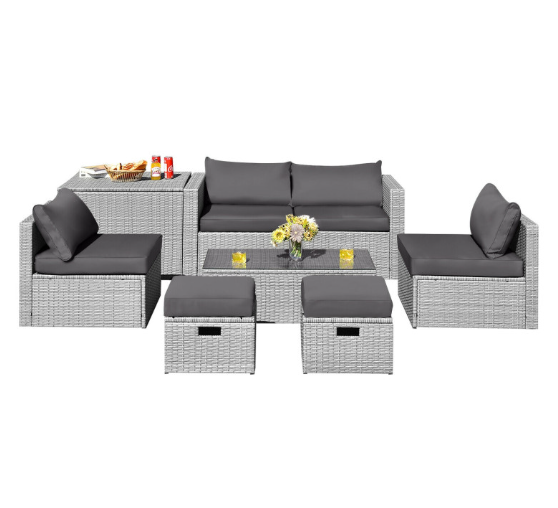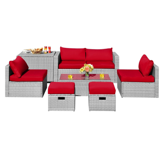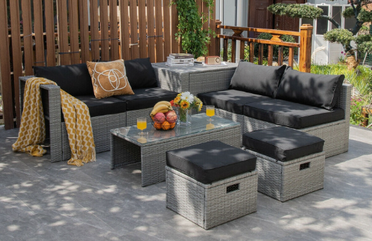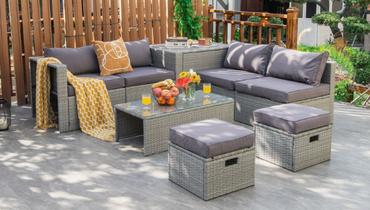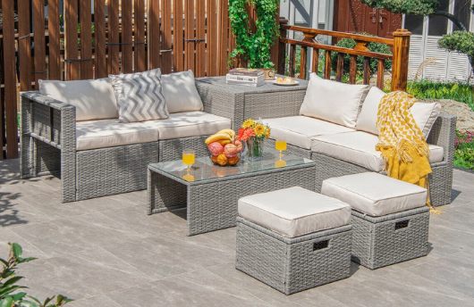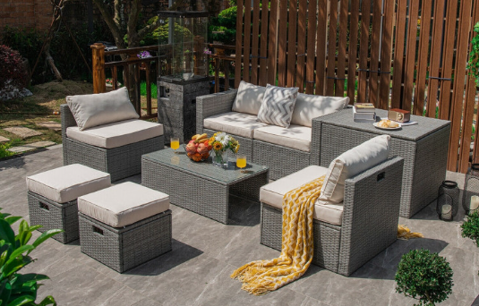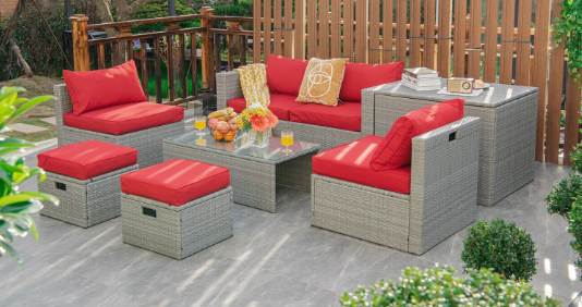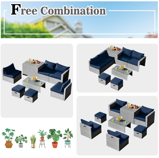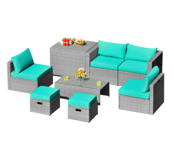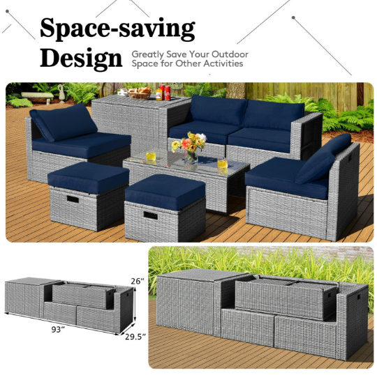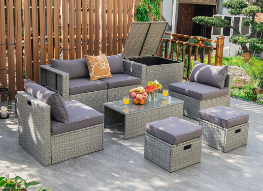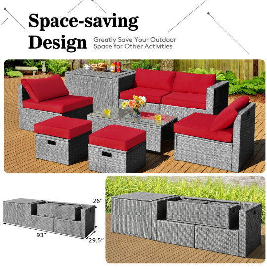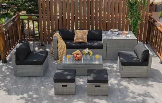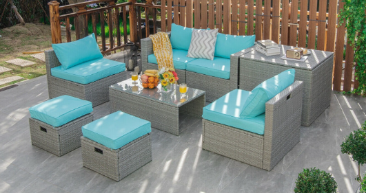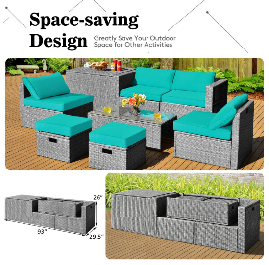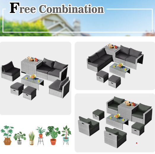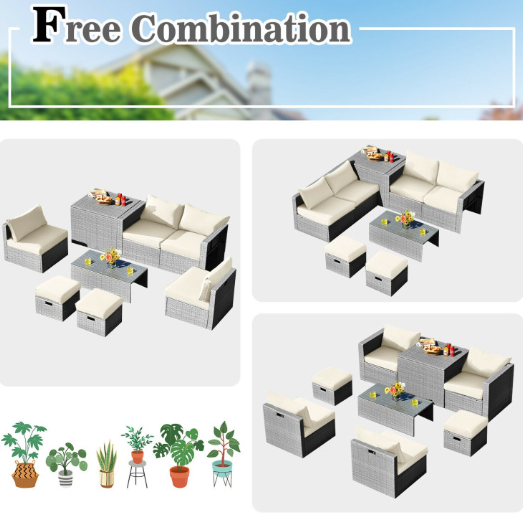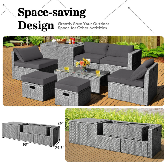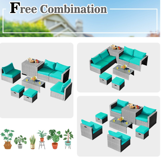 ● 8-piece Modular Set: In order to rearrange your outdoor space based on your preference and available place, this 8-piece outdoor patio furniture set with 1 tempered glass coffee table, 1 storage box, 2 ottomans, 2 armless sofas and 2 corner sofas allows you to combine them into different layouts for great flexibility.