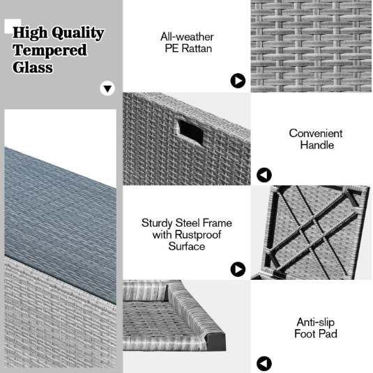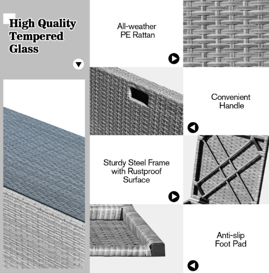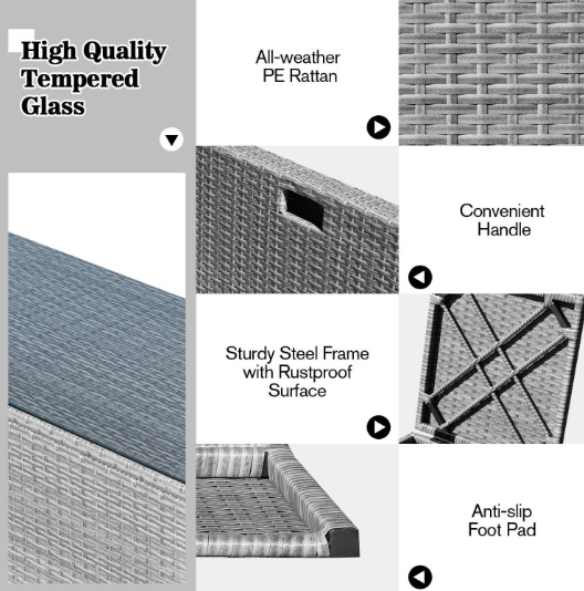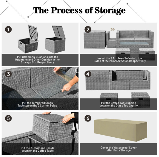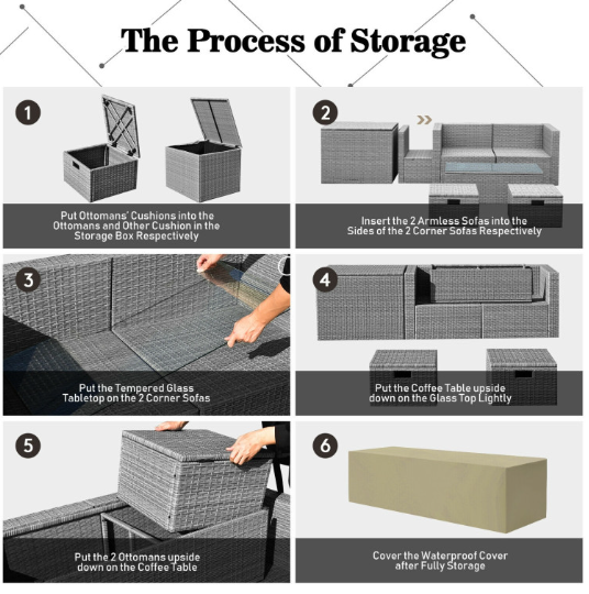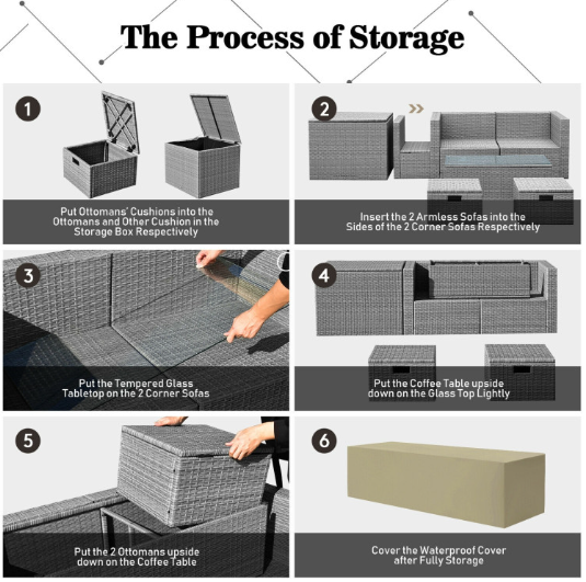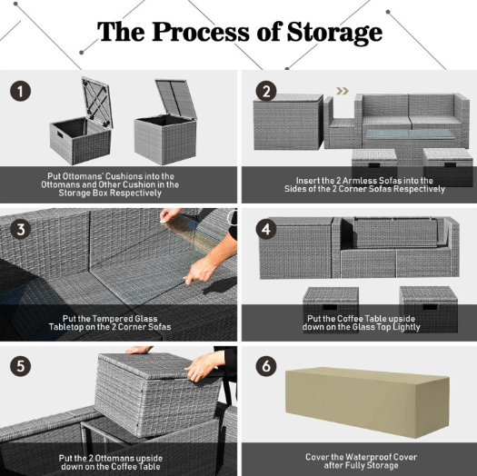 ● Waterproof Cover: After storage, there is a waterproof cover that allows you to cover it on the patio sectional set. Therefore, this furniture set can be left outside without worry. In addition, the weather resistant PE rattan and rustproof steel frame ensure its durability and firmness when used outdoors. And the anti-slip foot pads add extra stability while protecting the floor from scratching.