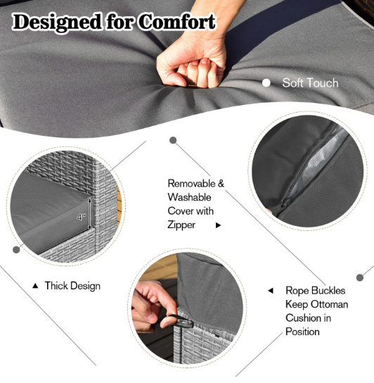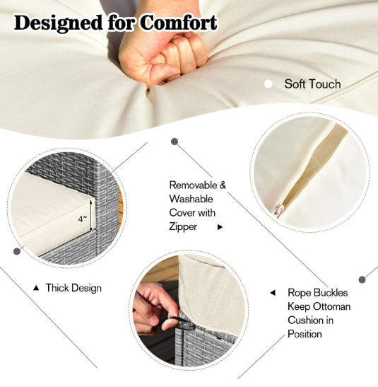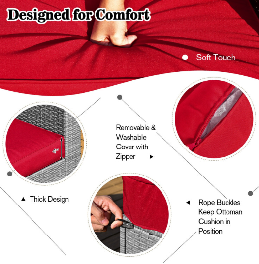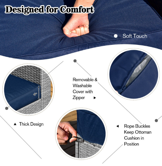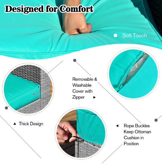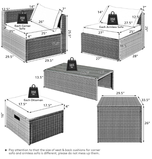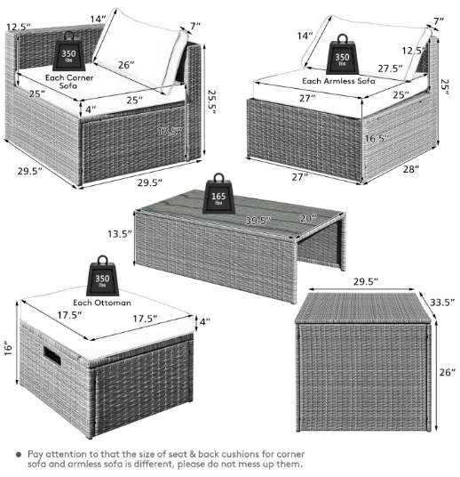 ● Comfy Cushions: Each ottoman, armless sofa and corner sofa are equipped with soft and thick cushions for optimal comfort. When you put legs on the ottomans, the ottomans' cushions will not slip away because of fixing ropes and buttons. Besides, all the cushion covers can be removable for easy cleaning. Please note that the dimensions of the back and seat cushions of the armless sofa and corner sofa are different, do not mess them up. Take cushions inside if it rains.