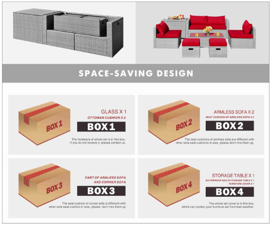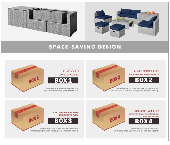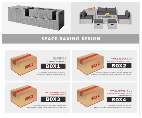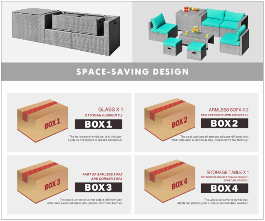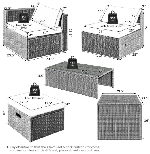 ● Product Information: The full set comes in 4 separate packages, which might not arrive on the same day. Overall dimension of table: 39.5" x 20" x 13.5" (L x W x H), overall dimension of storage box: 33.5" x 29.5" x 26" (L x W x H), overall dimension of each ottoman: 17.5" x 17.5" x 16" (L x W x H), overall dimension of each corner sofa: 29.5" x 29.5" x 25.5" (L x W x H), overall dimension of each armless sofa: 28" x 27" x 25" (L x W x H).