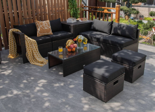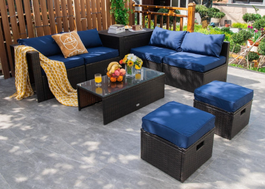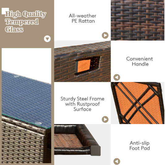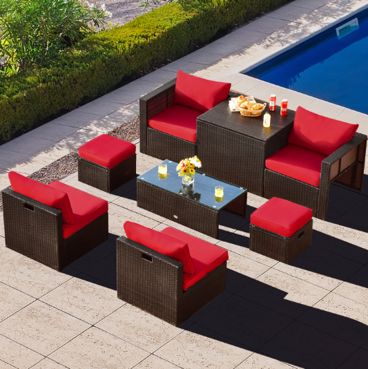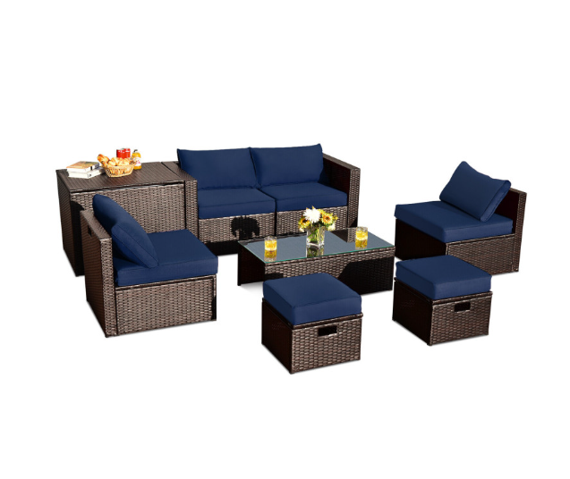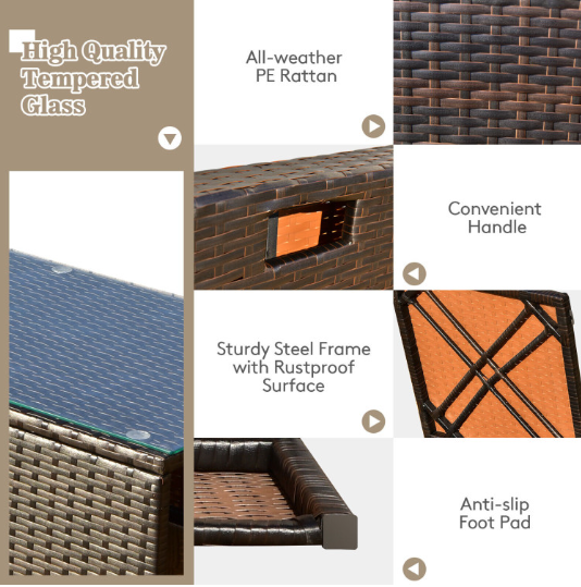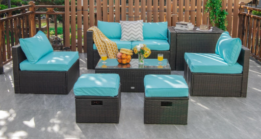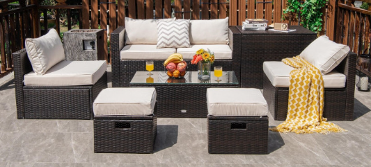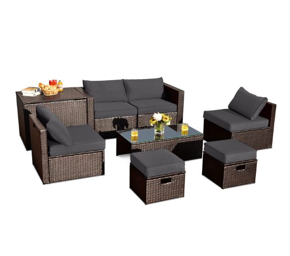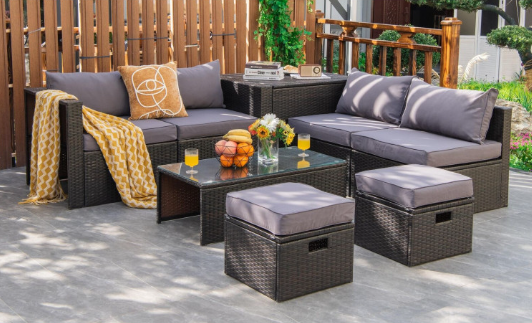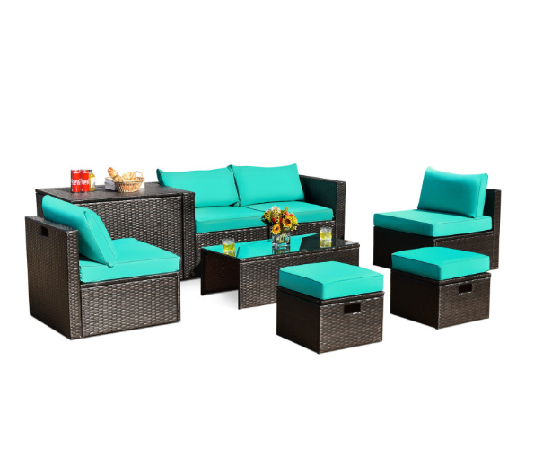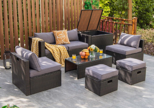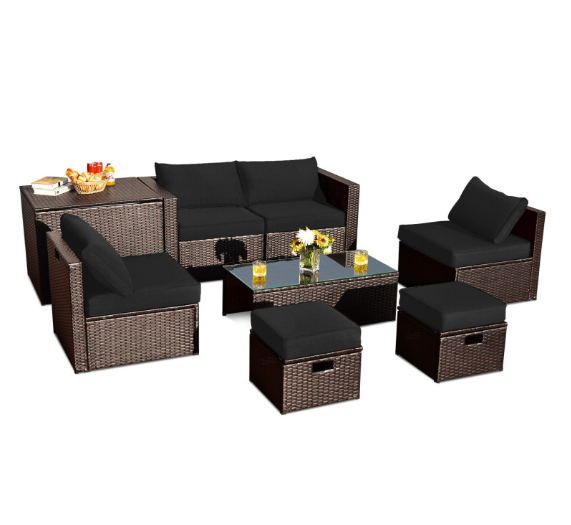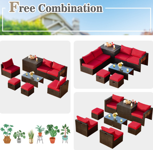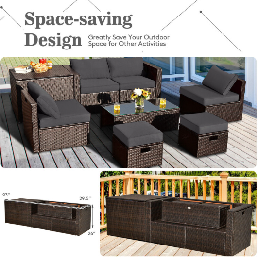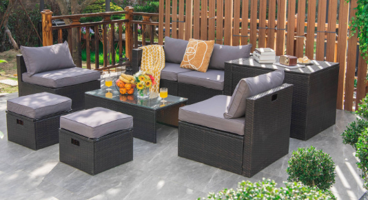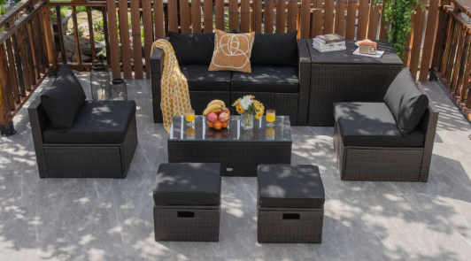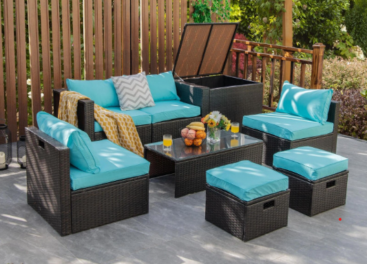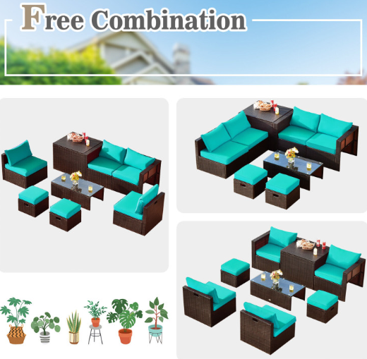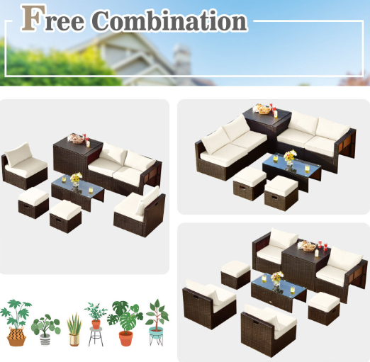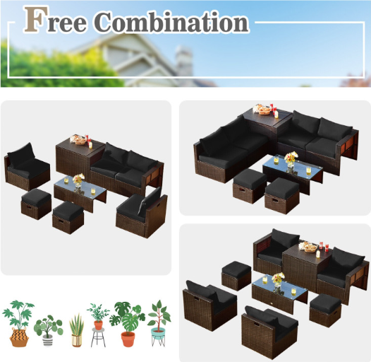 ● 8-piece Modular Set: In order to rearrange your outdoor space based on your preference and available place, this 8-piece outdoor patio furniture set with 1 tempered glass coffee table, 1 storage box, 2 ottomans, 2 armless sofas and 2 corner sofas allows you to combine them into different layouts for great flexibility.