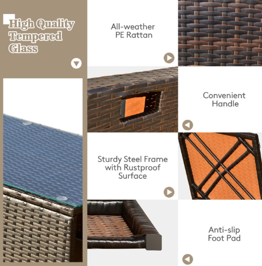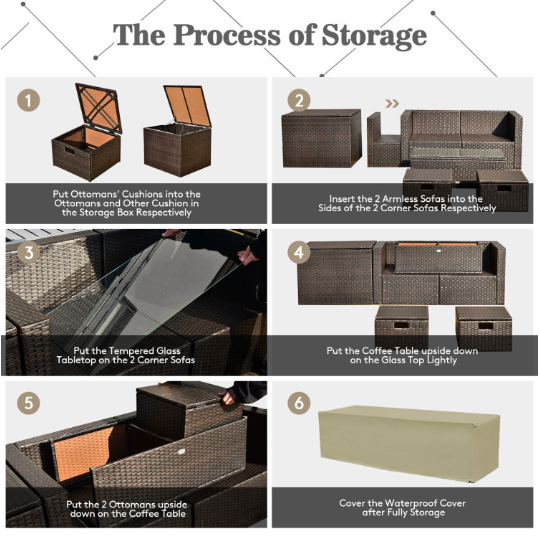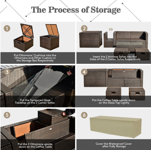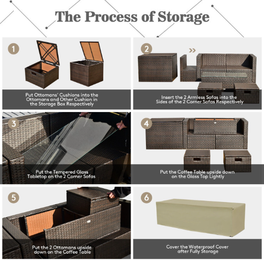 ● Waterproof Cover: After storage, there is a waterproof cover that allows you to cover it on the patio sectional set. Therefore, this furniture set can be left outside without worry. In addition, the weather-resistant PE rattan and rustproof steel frame ensure its durability and firmness when used outdoors. And the anti-slip foot pads add extra stability while protecting the floor from scratching.