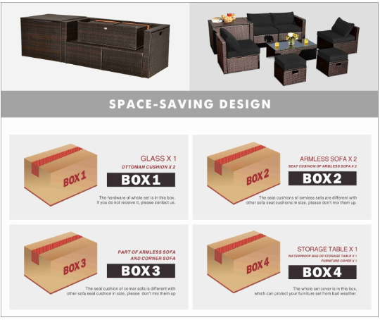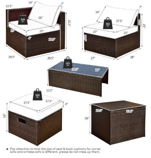 ● Product Information: The full set comes in 4 separate packages, which might not arrive on the same day. Overall dimension of table: 39.5" x 20" x 13.5" (L x W x H), overall dimension of storage box: 33.5" x 29.5" x 26" (L x W x H), overall dimension of each ottoman: 17.5" x 17.5" x 16" (L x W x H), overall dimension of each corner sofa: 29.5" x 29.5" x 25.5" (L x W x H), overall dimension of each armless sofa: 28" x 27" x 25" (L x W x H).