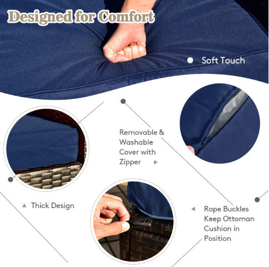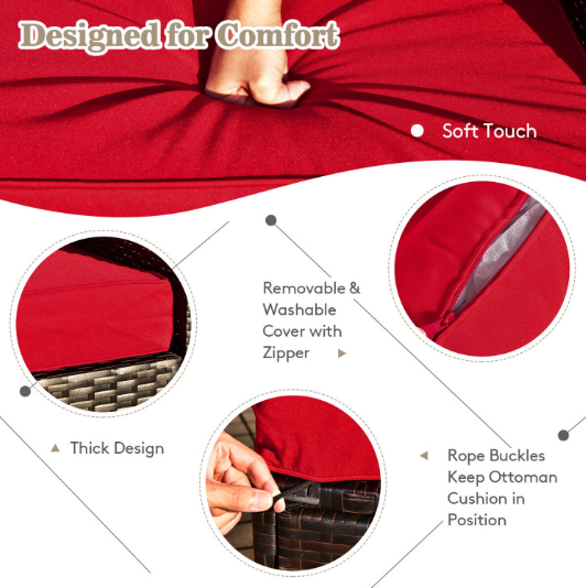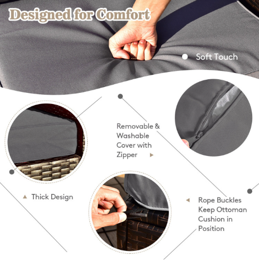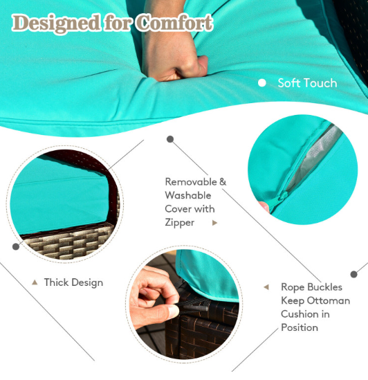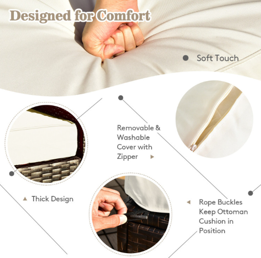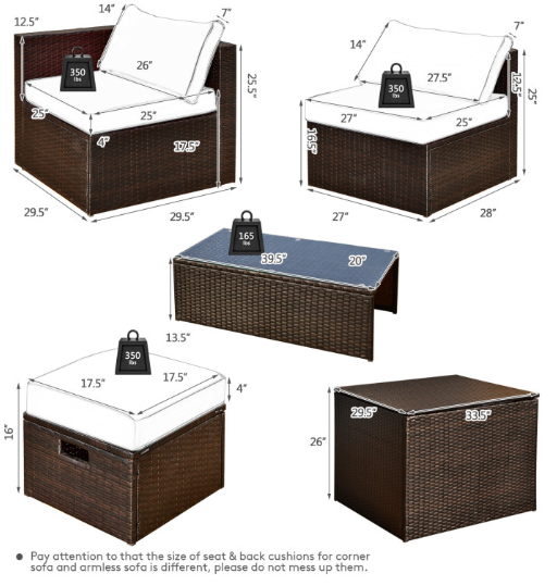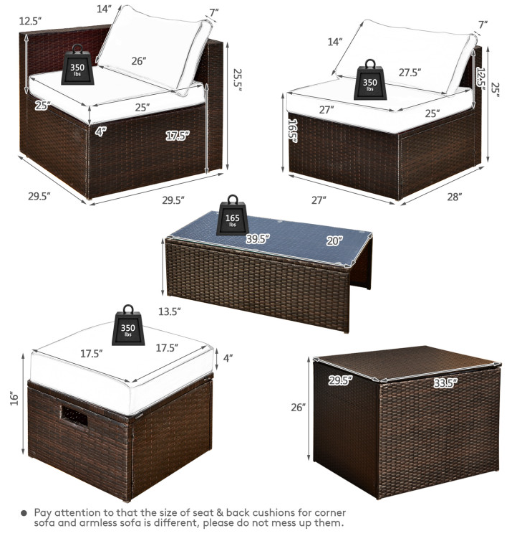 ● Comfy Cushions: Each ottoman, armless sofa and corner sofa are equipped with soft and thick cushions for optimal comfort. When you put legs on the ottomans, the ottomans' cushions will not slip away because of fixing ropes and buttons. Besides, all the cushion covers can be removable for easy cleaning. Please note that the dimensions of the back and seat cushions of the armless sofa and corner sofa are different, do not mess them up. Take cushions inside if it rains.