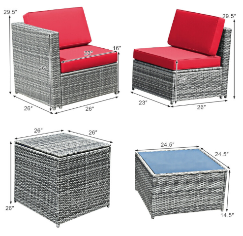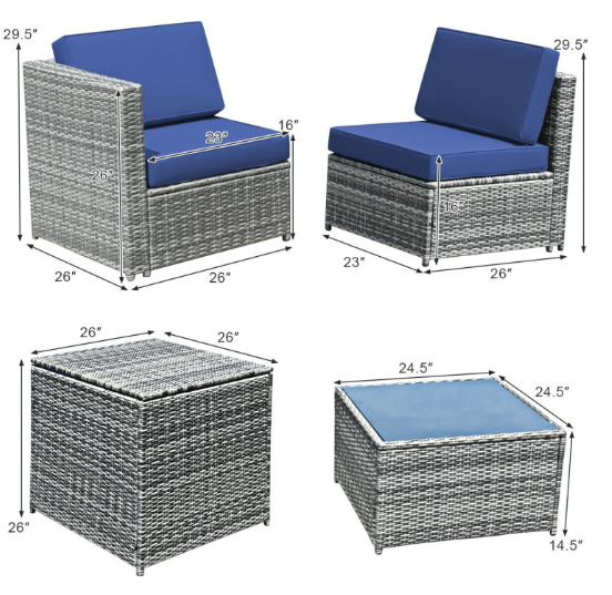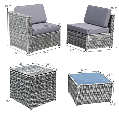 ● Dimension of 8 Pieces Patio Set: armless sofa: 23" x 26" x 29.5" (L x W x H), corner sofa: 26" x 26" x 29.5" (L x W x H), table: 24.5" x 24.5" x 14.5" (L x W x H), storage cabinet: 26" x 26" x 26" (L x W x H), weight capacity of sofa: 360 lbs