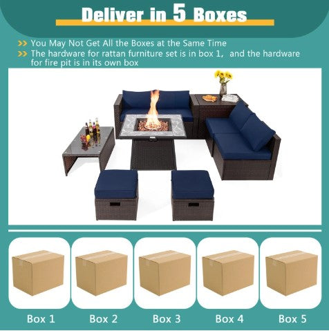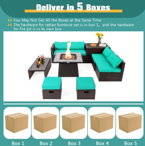 9 Pieces Patio PE Wicker Sectional Set with 50000 BTU Fire Pit Table