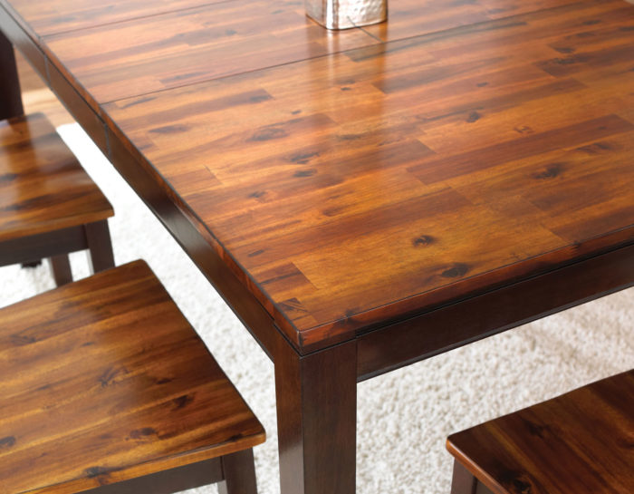 - Styling details include a table top and chair seats with a solid wood butcher block design and ergonomic ladder back chair with scooped solid wood seat