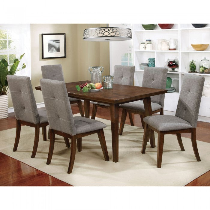 Mid-century inspired details take this dining collection from ordinary to extraordinary! Flared angular legs and visible wood grain give a retro twist that will ensure your collection stands out from the rest. Tufting adorns the gray fabric chairs while the rich walnut finish pairs beautifully with both table and chairs.