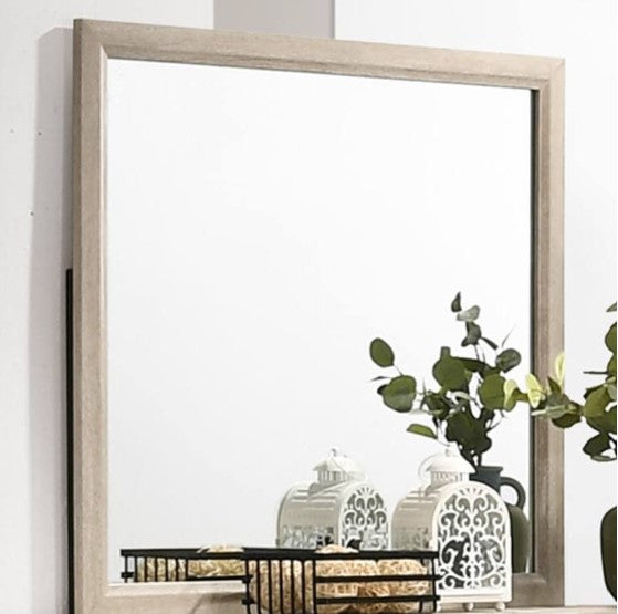 The Akerson Dresser Mirror from Crown Mark is a contemporary, driftwood-colored piece perfect for any modern interior. Crafted from hardwood solids and veneers, this piece is both durable and stylish. The distressed finish and simple lines, combined with its clean design, emphasize the modern look and make it a great addition to any bedroom.