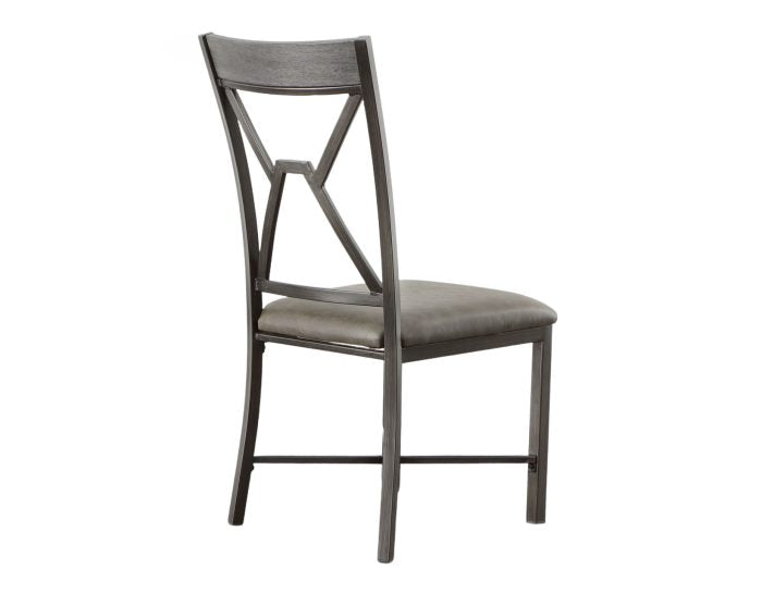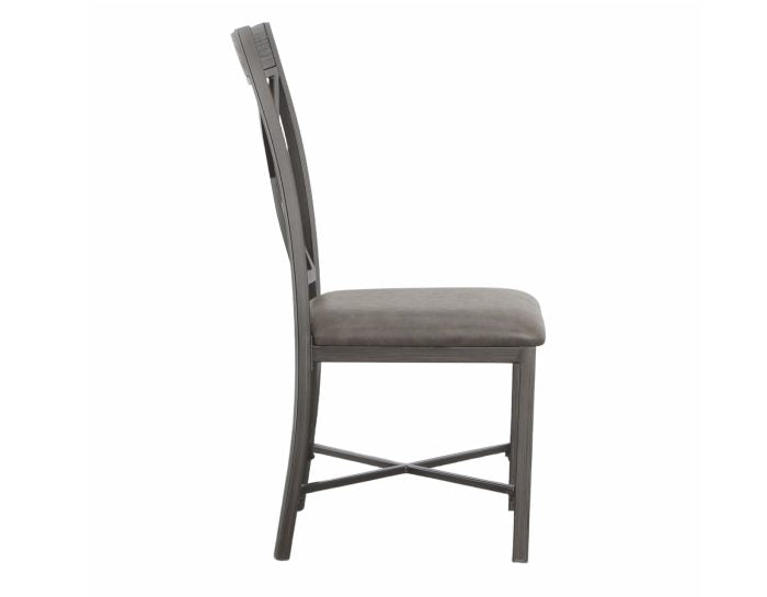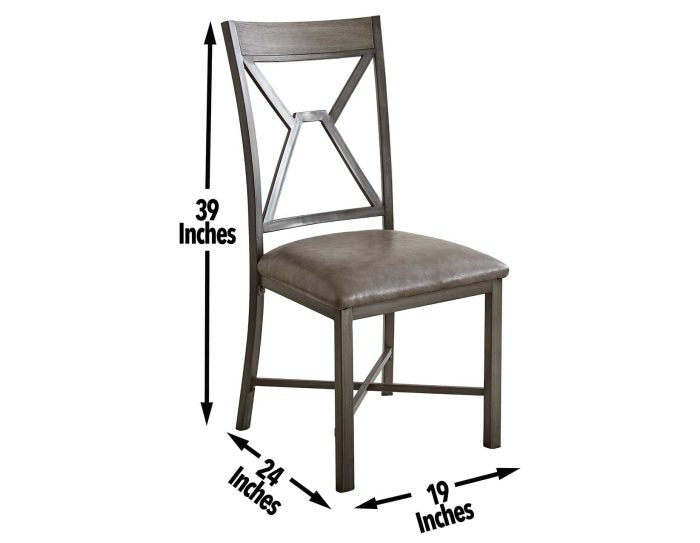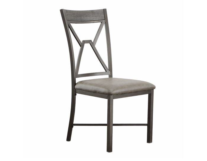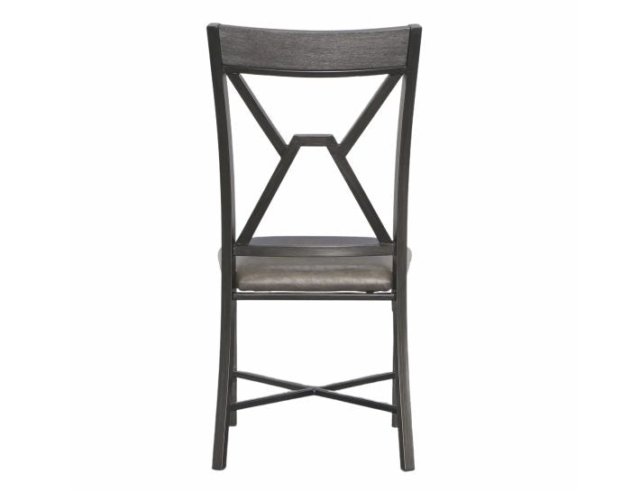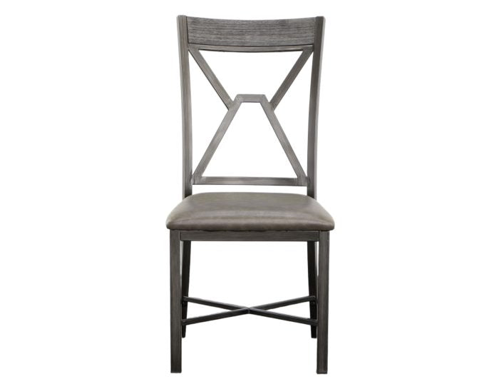Mixed media and geometric designs combine in a soft gray palette for the Alamo Dining Collection. The Alamo Dining Chairs feature a grey metal finish with black hand brush accents with padded grey vinyl seat and a wooden cap rail with a unique geometric metal back design. X stretchers not only add a design element but strength and stability to the chairs as well. Also available is the matching Alamo dining table (purchase separately). Your purchase includes two dining chairs.