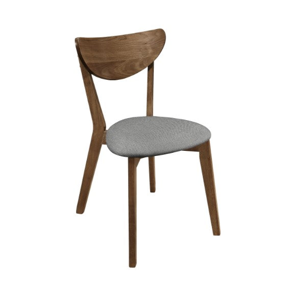 Mid-century modern-inspired, this five piece dining set welcomes a hint of retro pizzazz. In a natural walnut hue, the sleek table is given depth by an exposed wood grain. Tapered legs create an elegant and open look, elevated with clean style. The four included side chairs feature an armless silhouette and grey upholstered seat. The delicate cushion and streamlined back look mod and stylish.