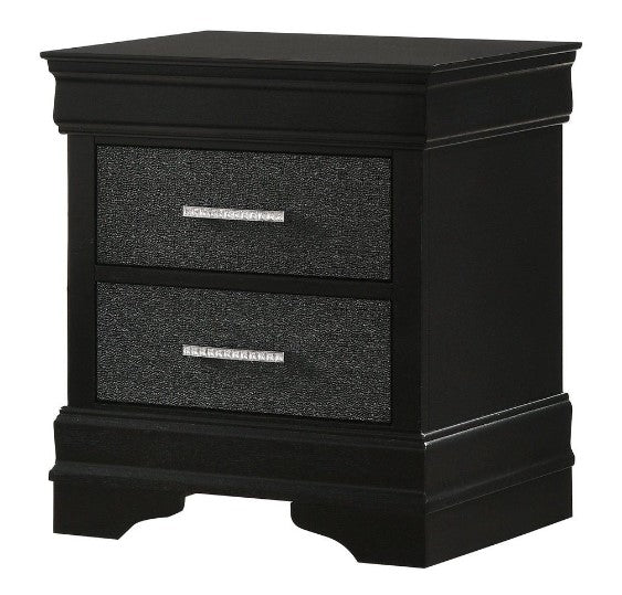 The Amalia 2 Drawer Nightstand from Crown Mark Furniture is the perfect addition to your modern glam bedroom decor. It has a durable construction with Hardwood Veneers and Solids, making it strong and sturdy. The nightstand features two drawers with classic metal pulls in a sleek, Black finish. The draws have crystal bar handles, dustproof bottoms with Kenlin metal center runner, ensuring items remain secure, and providing essential storage space. This nightstand is built to meet the challenges of changing humidity and is sure to impress with its shimmering details.