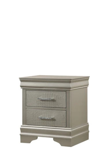The Amalia Nightstand from Crown Mark is a bold piece of furniture for adding a modern glam look to your bedroom. Featuring a champagne finish and crafted from durable hardwood veneers and solids, this nightstand provides ample storage with two drawers and crystal bar handles. Special features of this piece include Kenlin metal center runner, crocodile textured details, trimmed in beautiful molding and dustproof bottoms for added strength. This modern glam nightstand is sure to elevate your bedroom aesthetic and provide a lasting storage solution.
