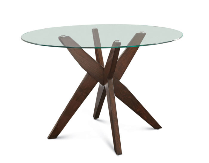 - Constructed of hardwood solids in a walnut color finish with round glass table top