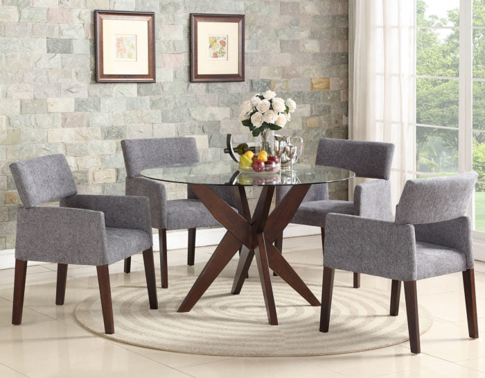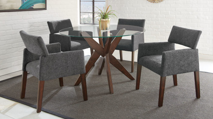 Amalie dining collection offers elegant casual dining in a compact shape. This beautiful 48-inch glass top table features a tempered glass table top paired with a walnut-finished wood table base for a neutral combination that pops. The archictectural base is aesthetically pleasing and can be appreciated by everyone seated at the table through the glass table top.