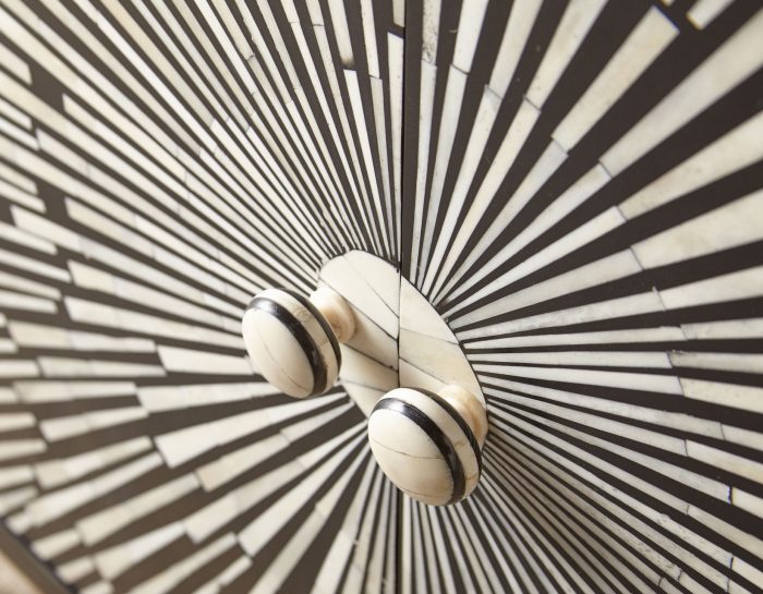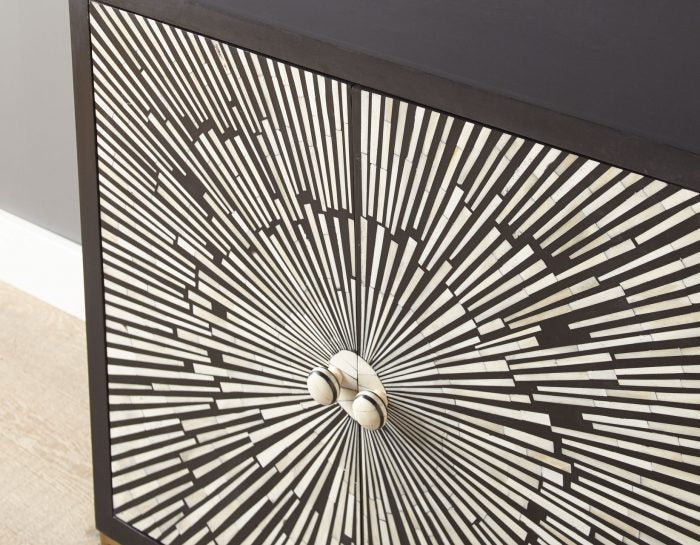 Modern elegance with an Art Deco design, Amika represents a timeless style in a functional Accent Cabinet. This piece is sure to become the centerpiece of any room with its sunburst of black and white bone and resin shards that adorn the front doors. A contemporary brass base and neutral hardware give the piece the feel of old Hollywood glamour. Two adjustable shelves provide storage for sweaters, clothing or even electronics to provide the ultimate in functionality and style.