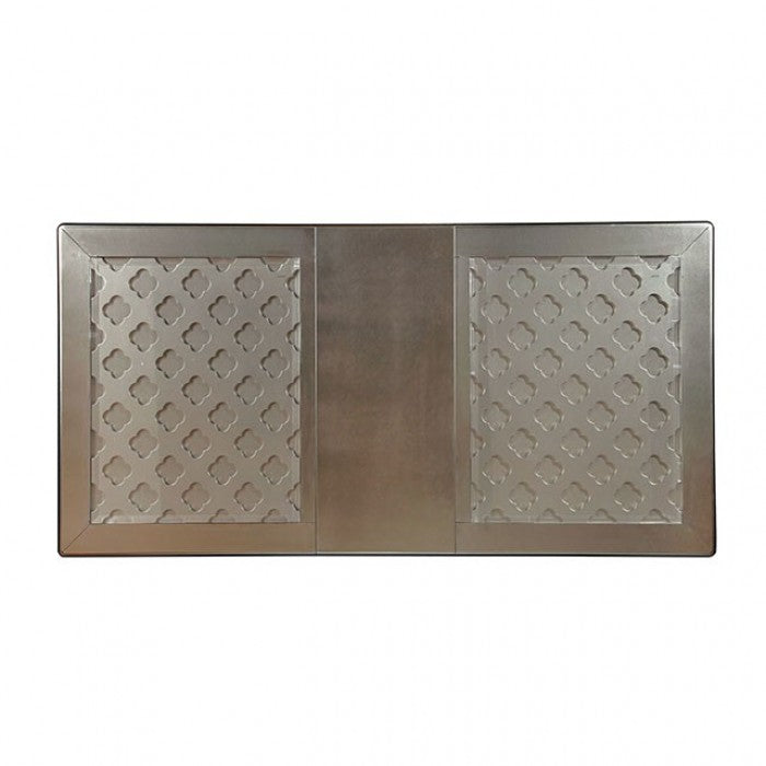 This dining collection will be the focal point of any home with its eye-catching silver finish and elegant structure. Double glass inserts draw attention to the Moroccan-inspired inset patterns while a convenient 18-inch leaf offers the option of hosting a large or intimate dinner. This dining set is the perfect statement addition to any dining area.