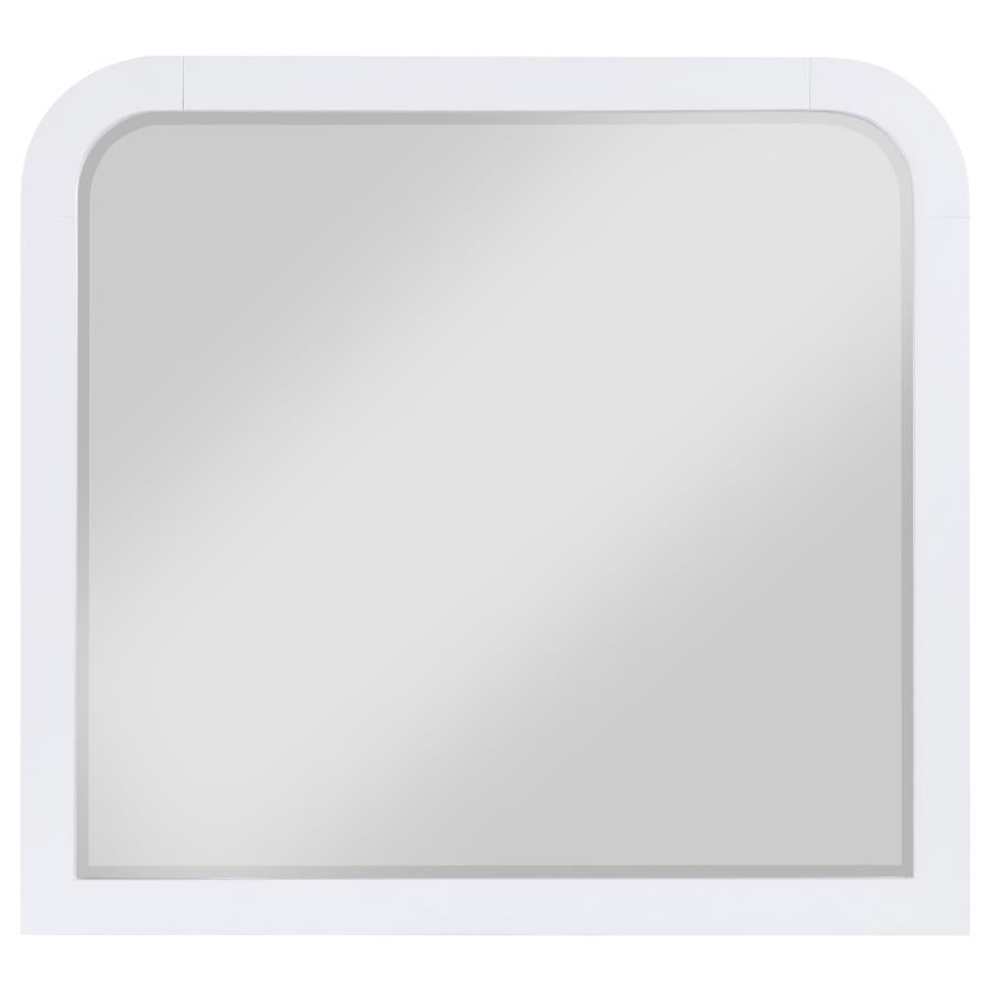 Simplicity of color and silhouette highlight a five-piece modern bedroom set that includes an upholstered bed, nightstand, chest, and dresser and mirror combination. Fresh and light, the set brings airy elegance, featuring a pearl white finish and light beige, textured upholstery over foam padded for exceptional lounging. The bed features a tall headboard and low footboard, with rounded corners echoed in the drawer fronts of each storage piece. With plenty of space for clothing, accessories, and beyond, the set offers felt lined top drawers perfect for delicate items. Elegant curves and clear bar pulls complete the set to perfection, delivering the lovely blend of sophistication and simplicity.