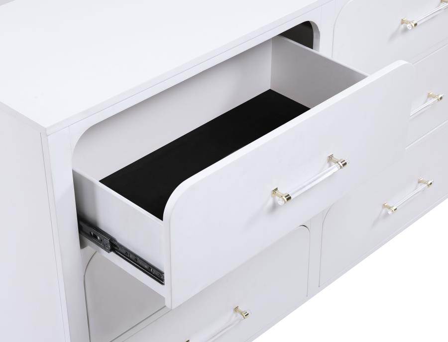 * Storage pieces feature clear acrylic bar pulls with gold-toned accents for a touch of contrast