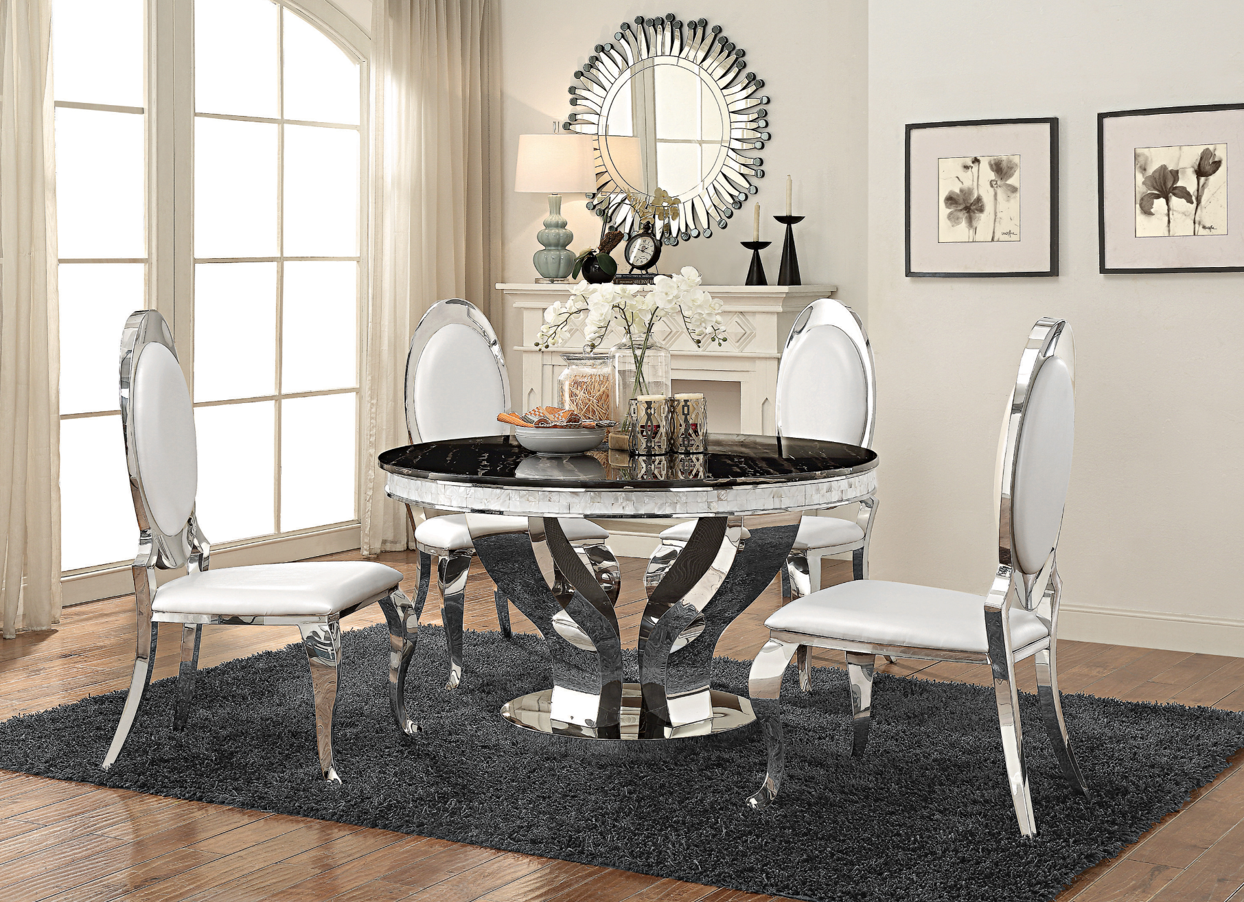 - This collection with polished chrome and black marble finishes is perfect for a luxurious and modern dining space