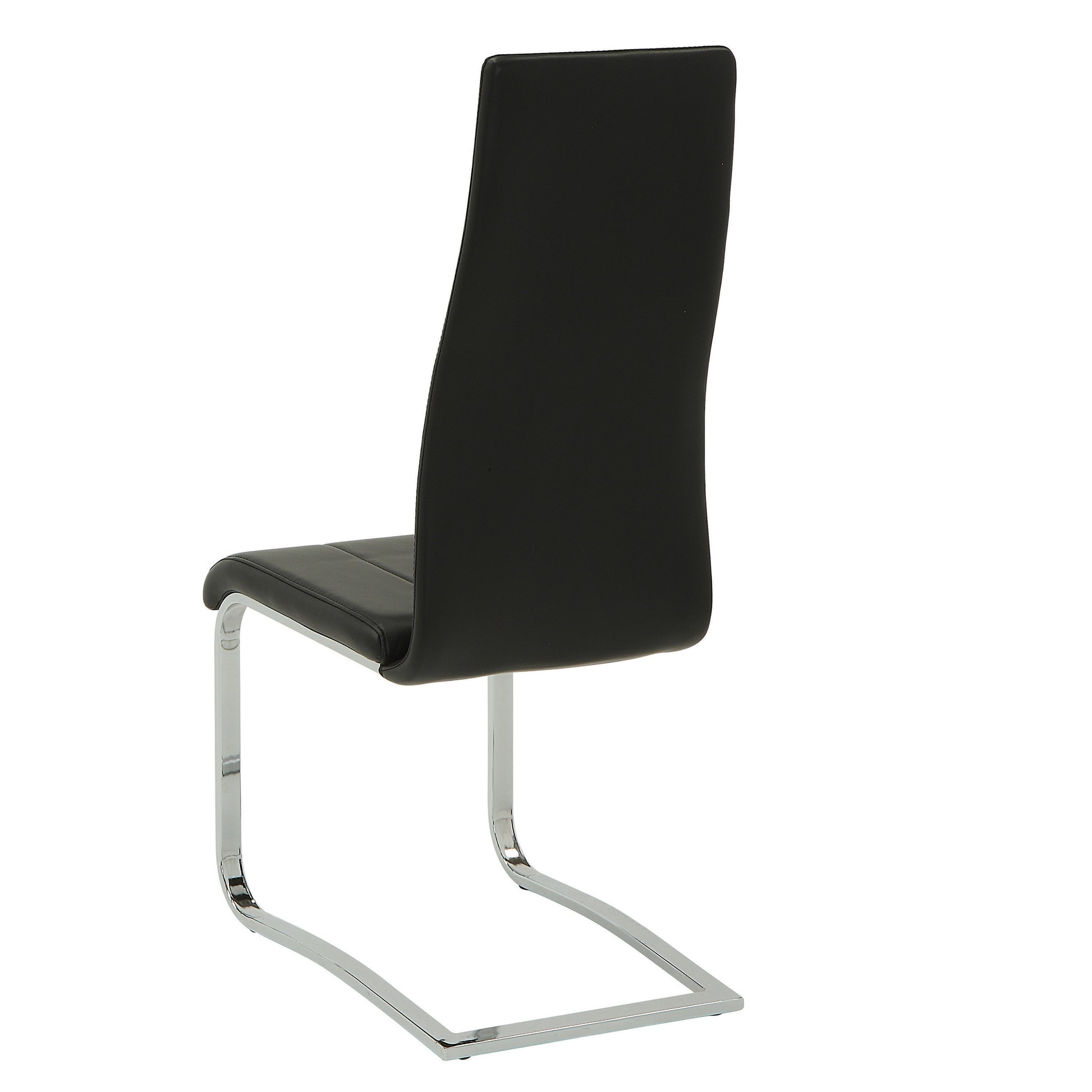 This dining side chair has a striking silhouette that's at once relaxed and contemporary. Seat back is ergonomically contoured to fit your back for comfortable sitting or discussing current events over coffee. Legs are finished in chrome. Chair is beautifully upholstered in black leatherette that lends simplistic authority. No back legs or armrests give it a modern feel.