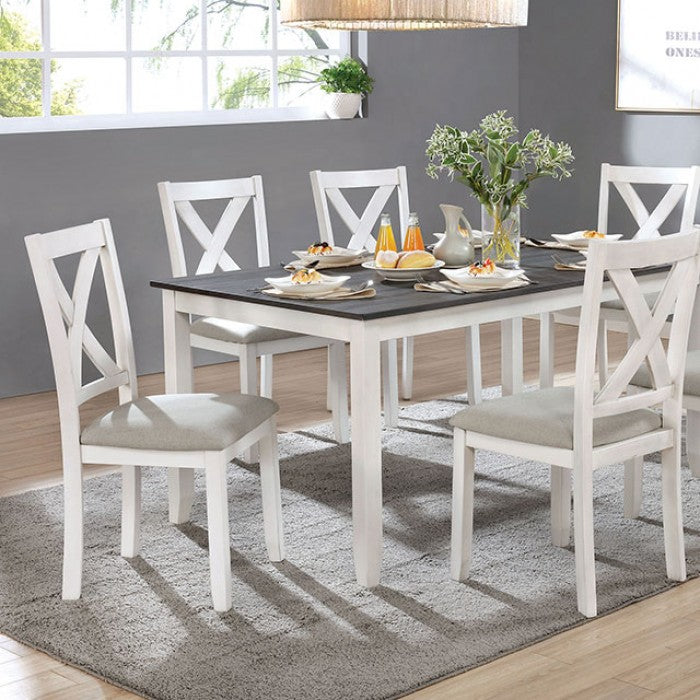 This is a traditional dining set for those who favor the character of natural wood. Its a timeless reliability shared with the solid construction necessary to accommodate small gatherings. The two-tone table features ample surface space via the overlapping dark wood grain top. The comfort of the cushioned-fabric crossback chairs is a subtle delight that inspires a relaxed feeling, calming thoughts of haste and ensuring years of meal time bonding with friends and family.