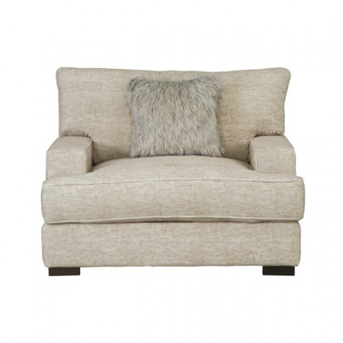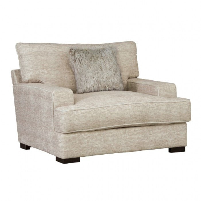 Add rich comfort to your living space with this handsome collection. Loose pillow backs and seat cushions are all trimmed with same-color welt that add a sense of refinement. The low arms and wide seating it offers creates an inviting and bold aesthetic. The monotone colors from the body fabric and the assorted patterns on the accent pillows work very will with contemporary spaces that go for the understated look.